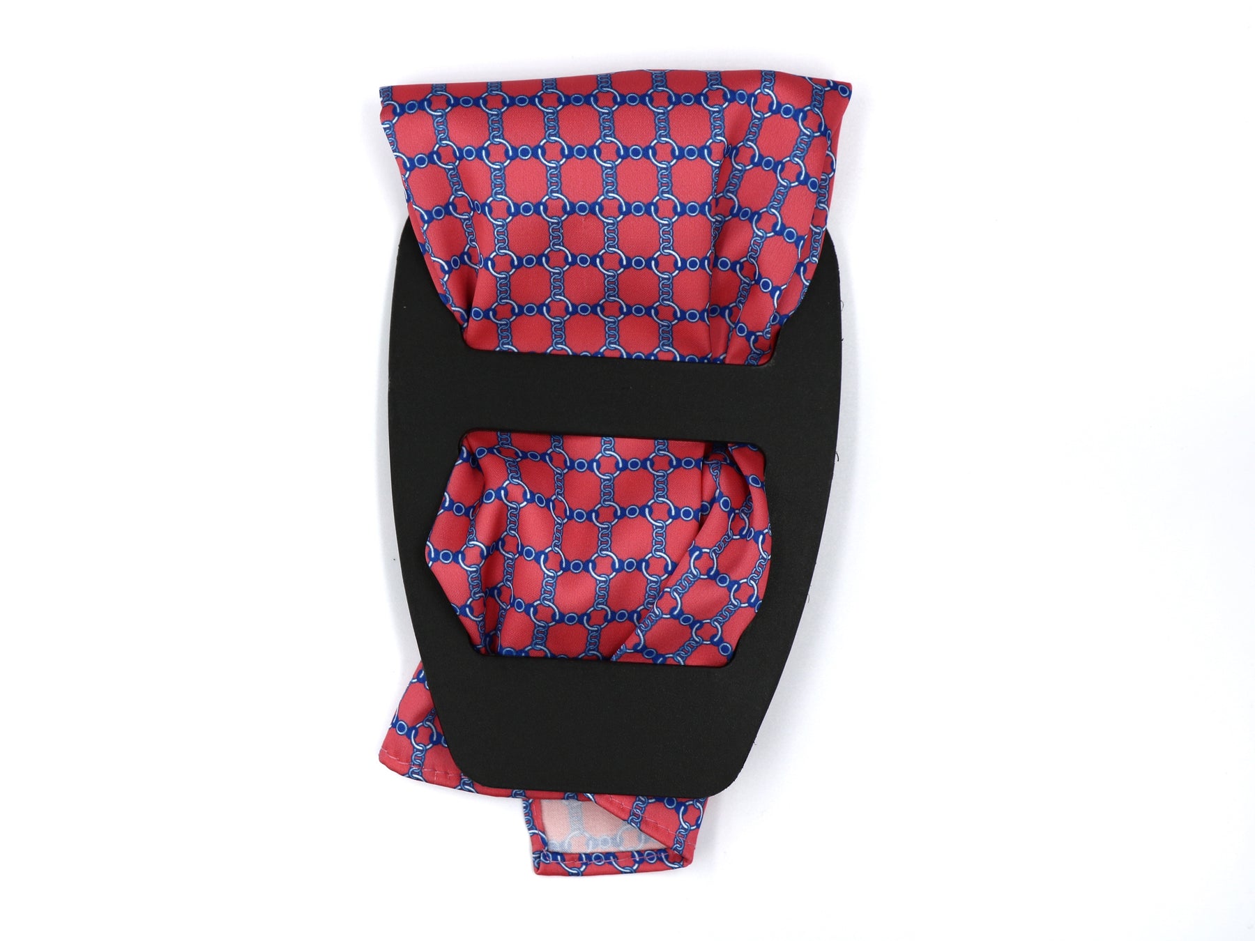 Crafted from 100% silk and measuring 25cm x 25cm, this pocket square features a soft pink background paired with an elegant light blue print. The repeating pattern resembles interlocking chain links, creating a crisp, symmetrical design that immediately draws the eye. The contrast between the pink base and cool blue detailing feels fresh and balanced.