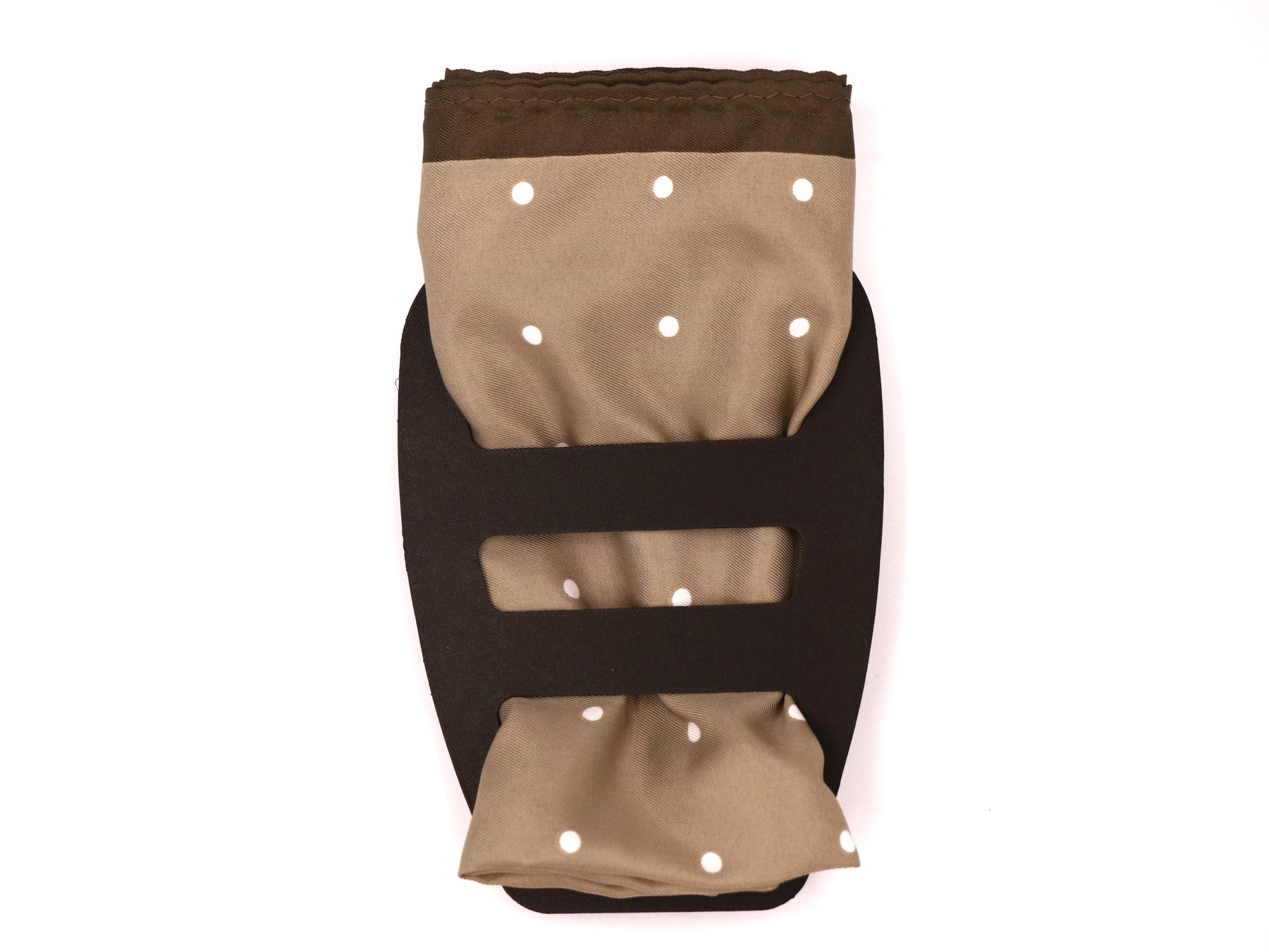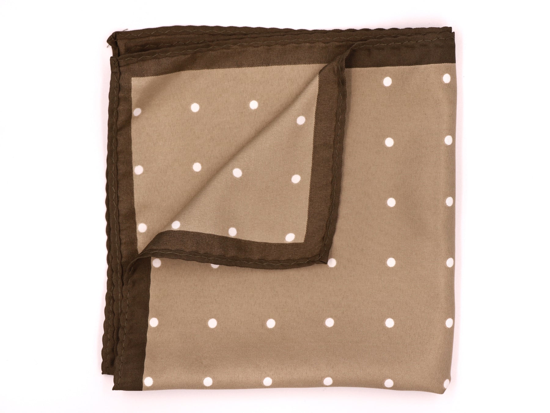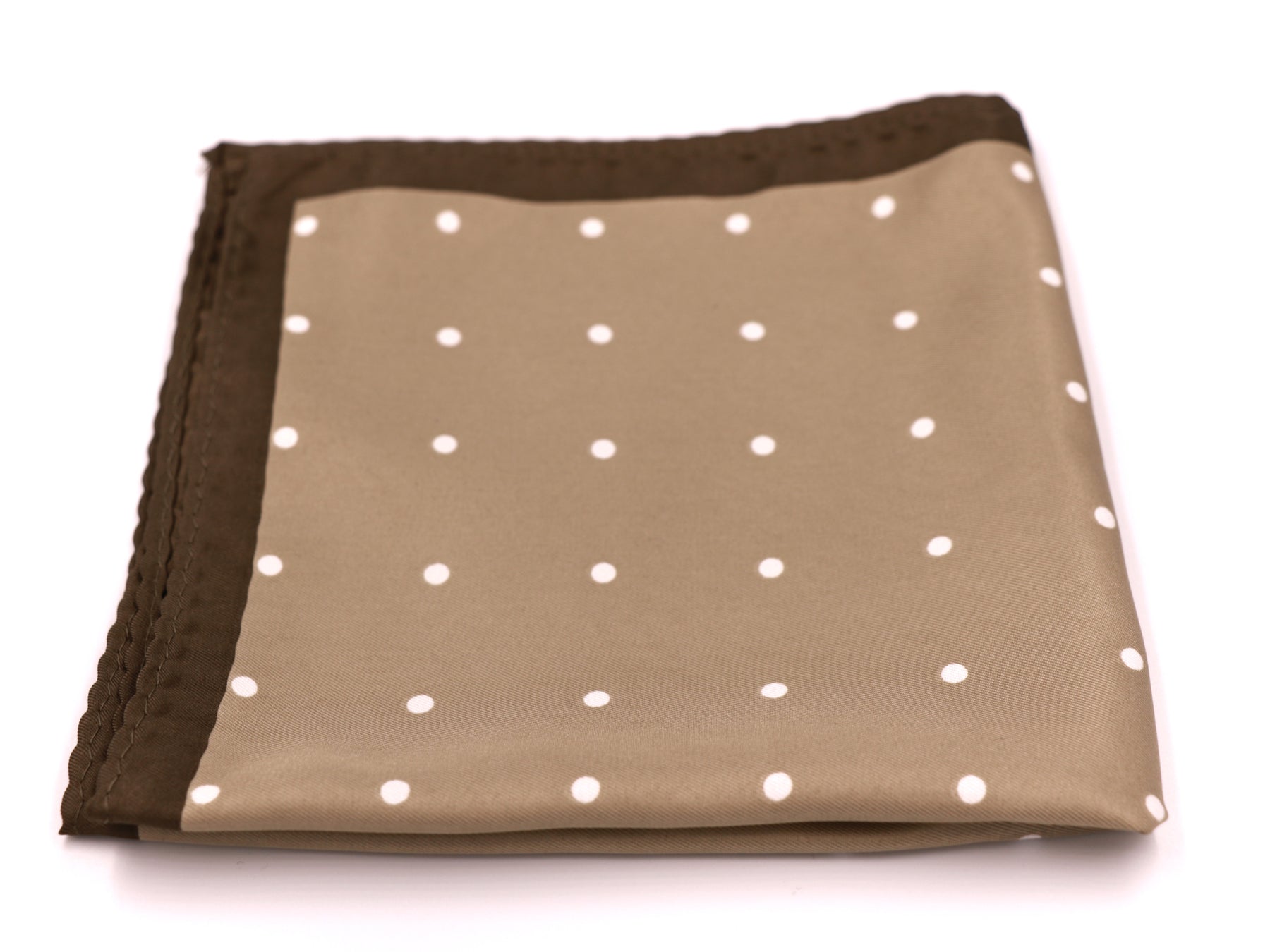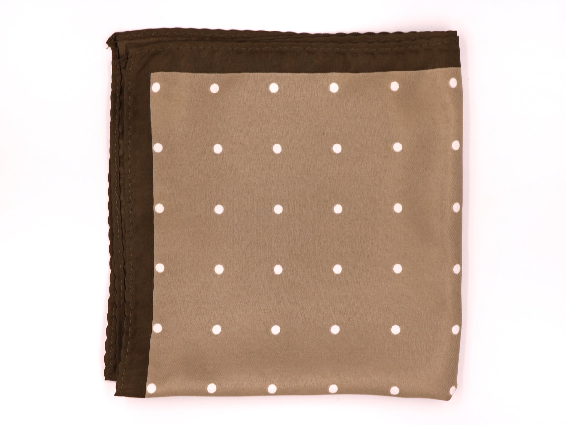Regular price $28.00Enjoy an earthy look with this extra large Mens pocket square. Featuring a classic off-white polka dot print on a warm tan coloured background, beautifully framed by a dark brown border, evoking the look of a 'country gent'.