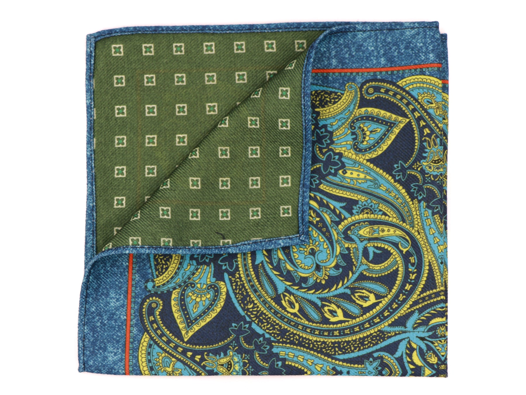 • Looking to buy a men’s green and turquoise pocket square that stands out while staying professional? This large paisley pocket square from The Tie Garden Executive Range is designed for modern gentlemen who want to elevate their suit with confidence. Featuring an intricate paisley pattern in rich green, deep blue and vibrant turquoise tones, this reversible pocket square is the perfect finishing touch for business suits, wedding attire, race day outfits, and formal events.