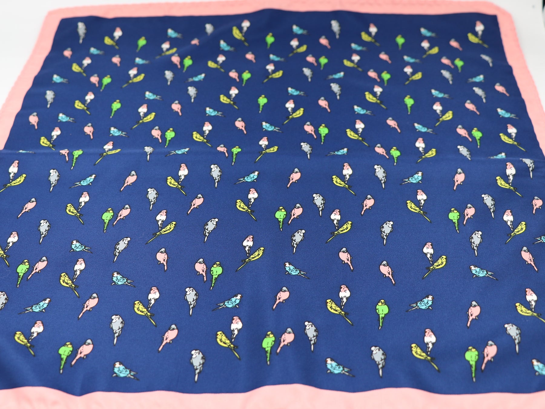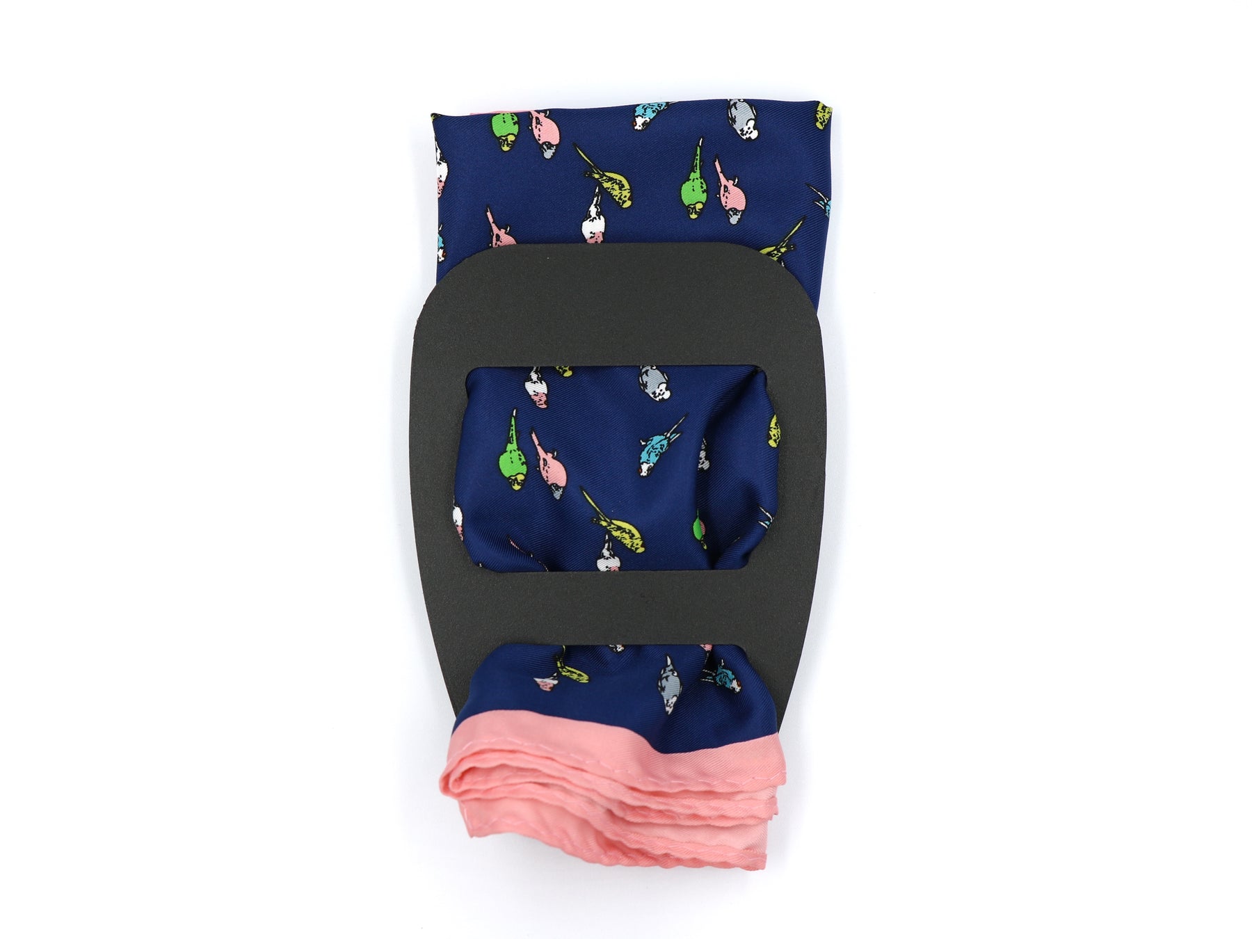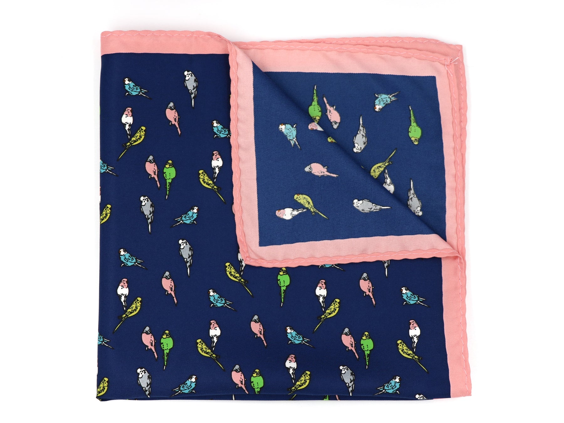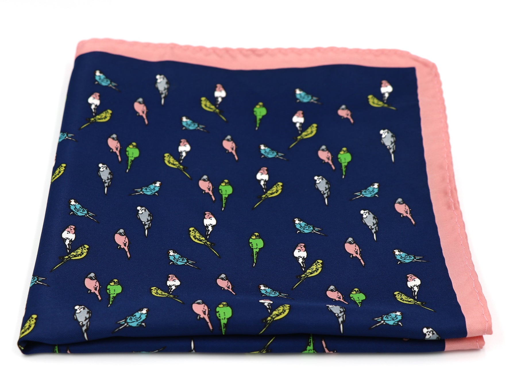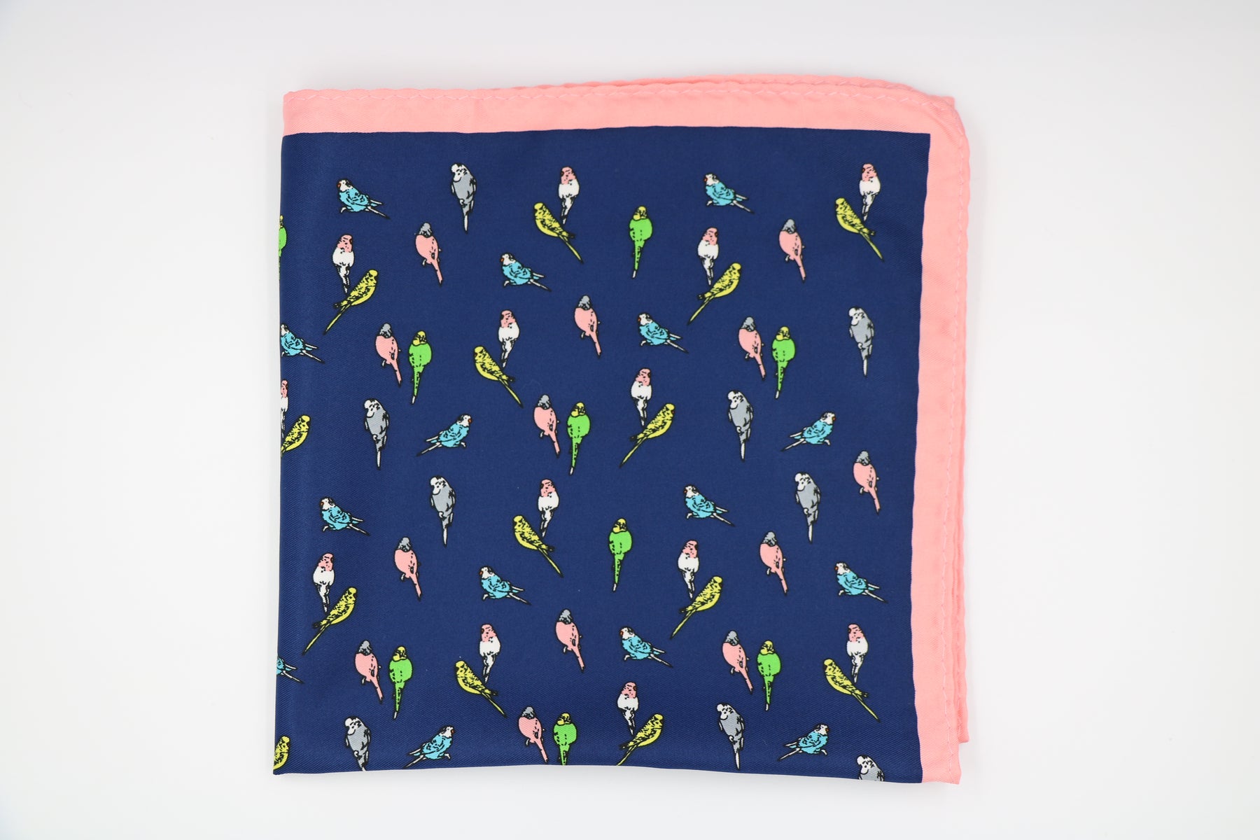 This large pocket square is a true gem. The navy blue background is both classic and sophisticated, while the budgie pattern adds a unique touch that is sure to be a conversation starter. The salmon pink border provides a pop of color, elegantly framing the design and making it stand out.