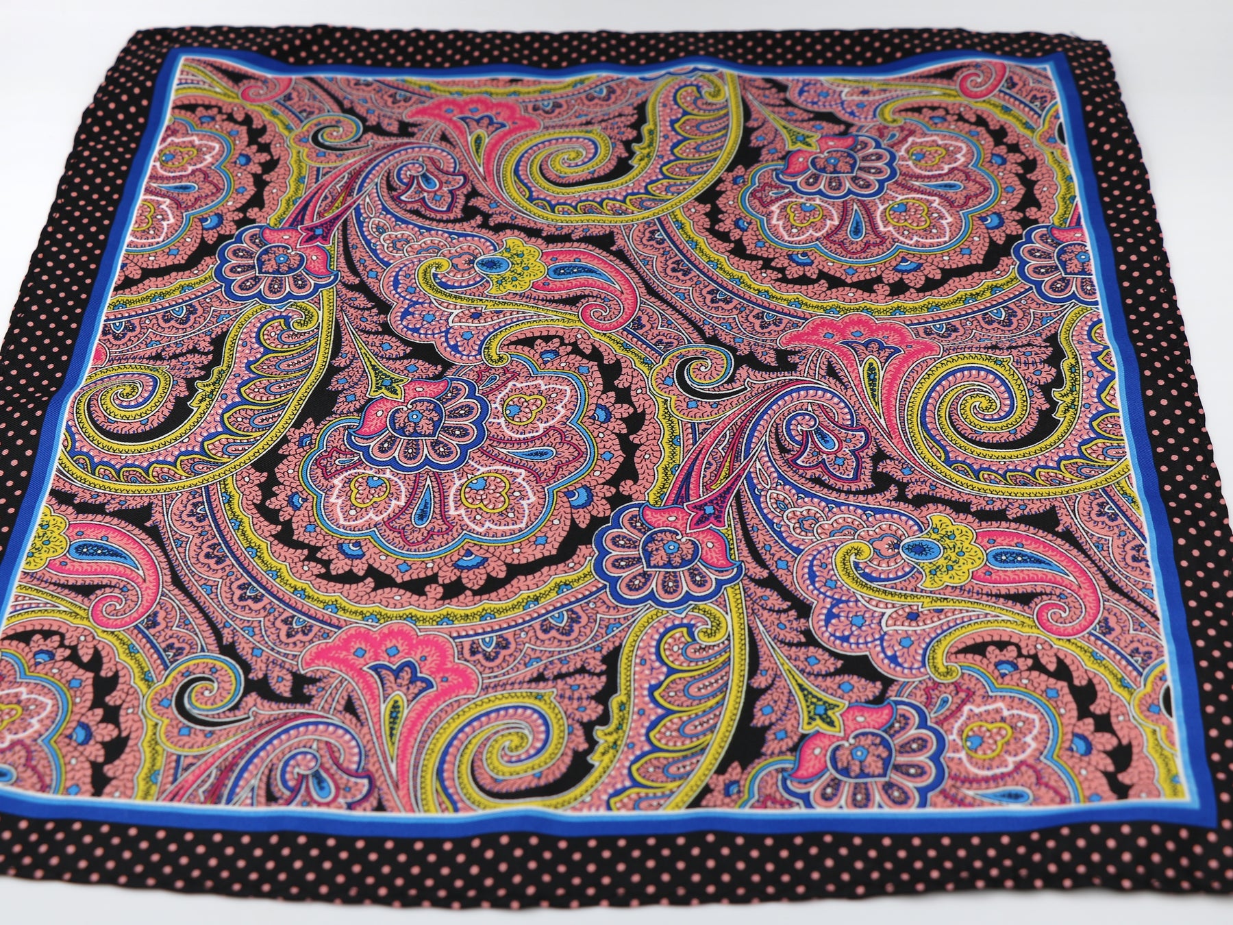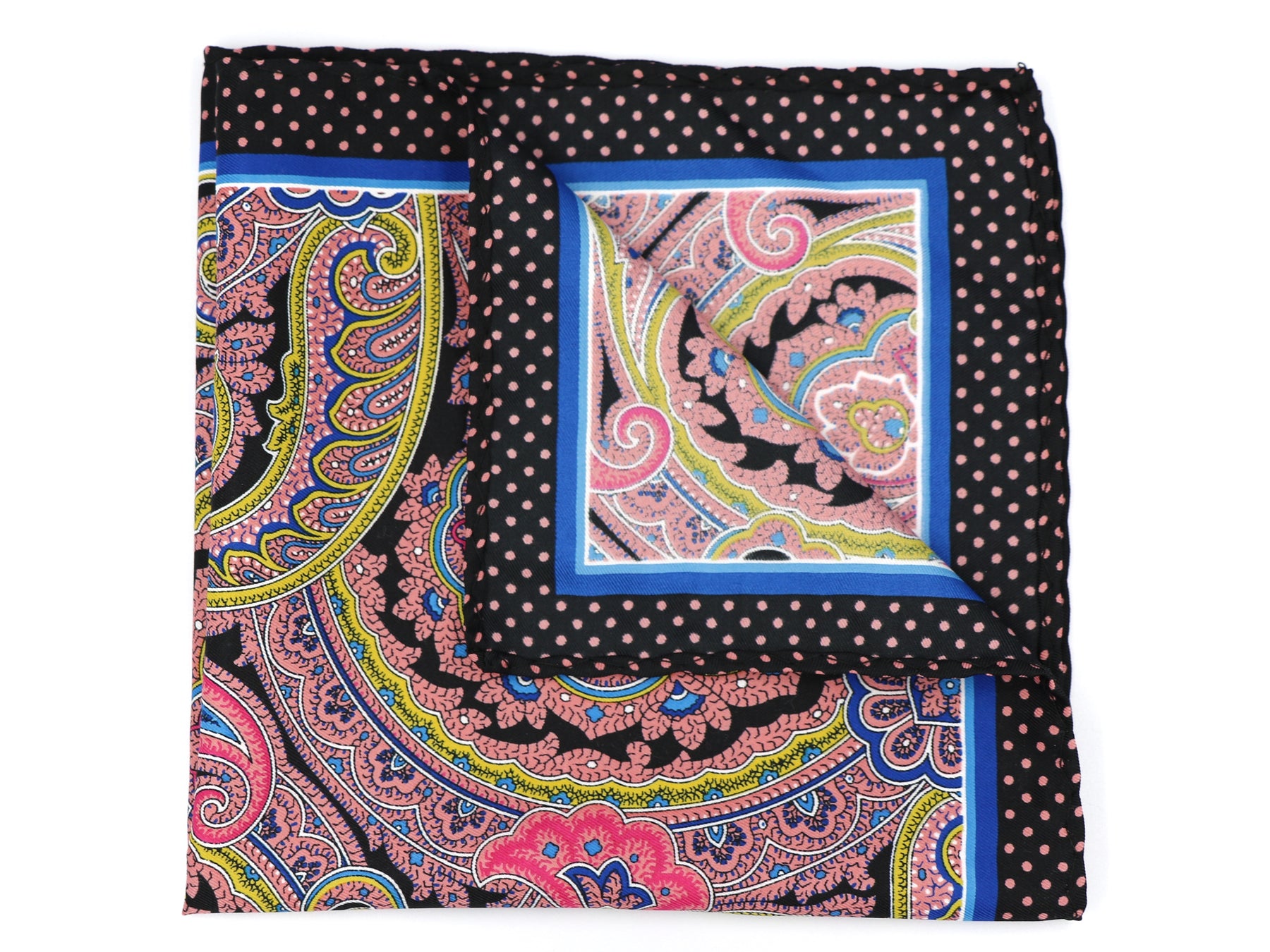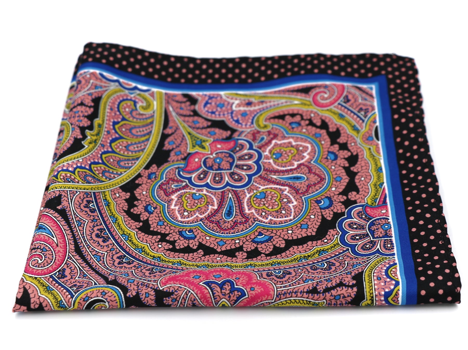 Keywords: executive pocket square, pink, black, multicolour paisley pattern, focal point, large pocket square, 32cm x 32cm, silk feel, flexible, pocket square holder, statement piece, men's fashion, blazer accessory, waistcoat accessory, workwear, night out, social occasions.