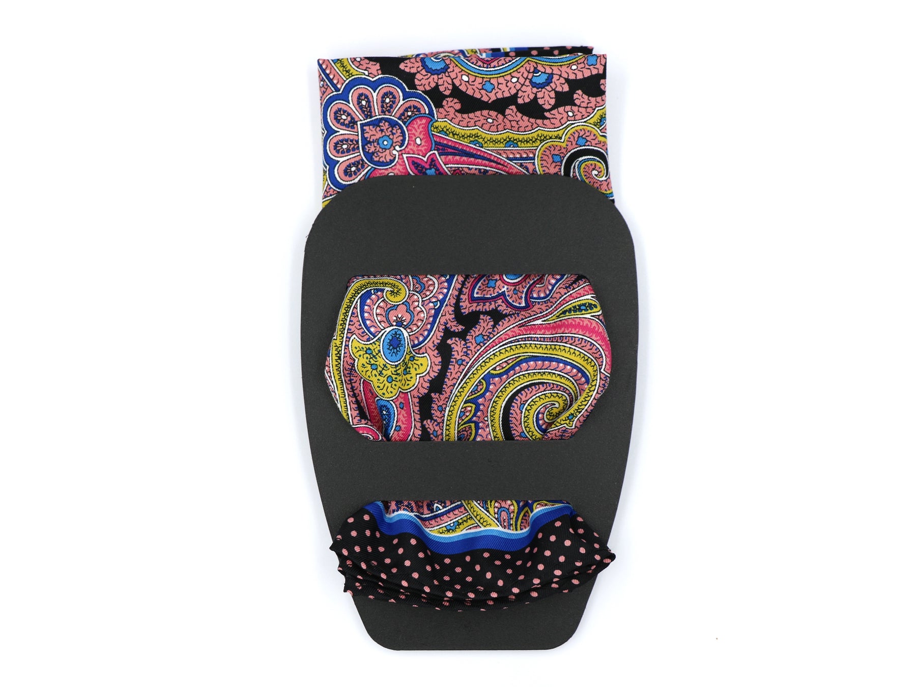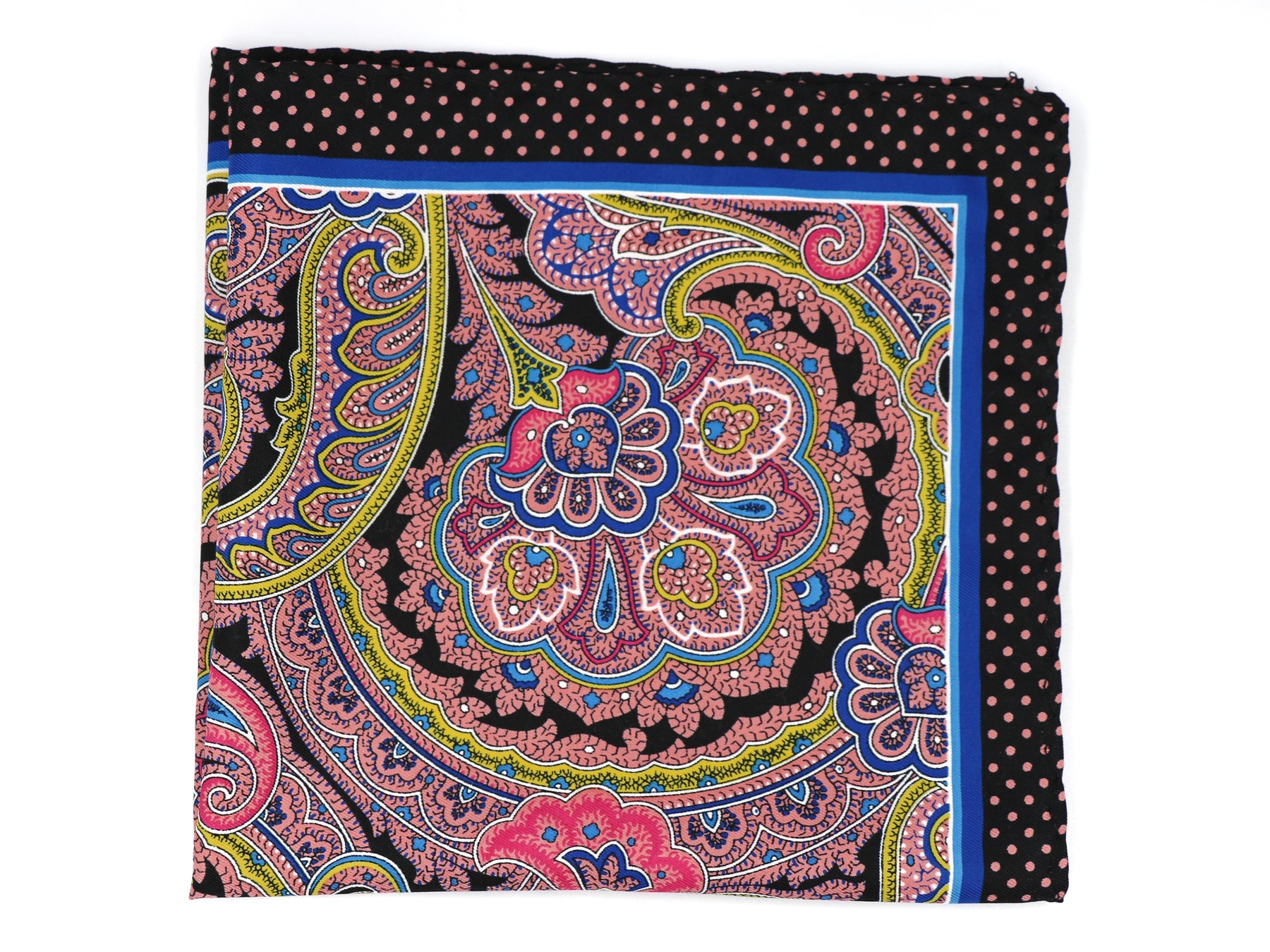 This beautiful, silk feel, patterned pocket square is designed for those who want their accessories to make a statement. The striking pink and black colour combination provides a dramatic backdrop for the intricate multicolour paisley pattern, making it a focal point for any blazer or waistcoat. The mix of vibrant hues adds a sophisticated and artistic touch to your style.