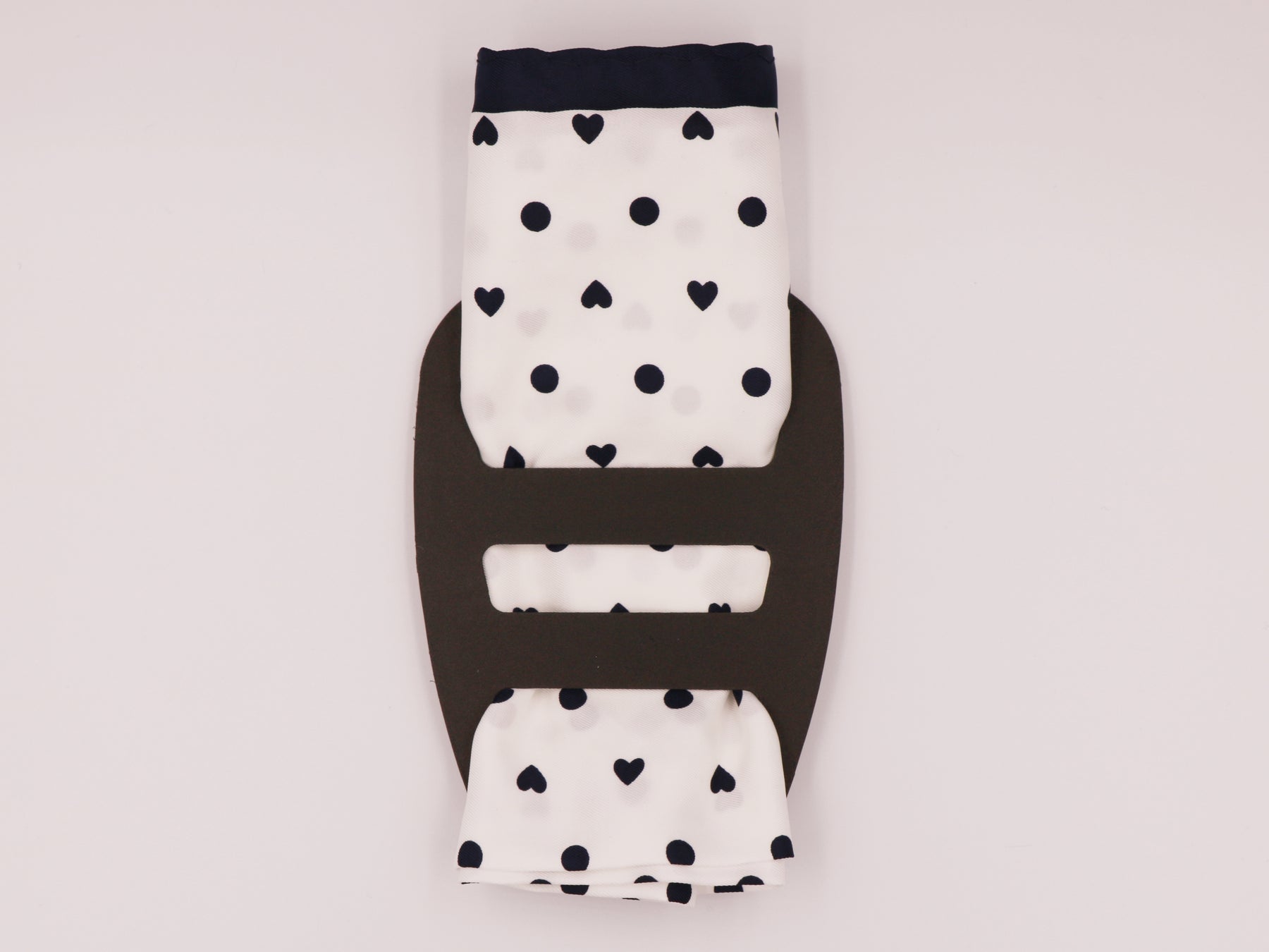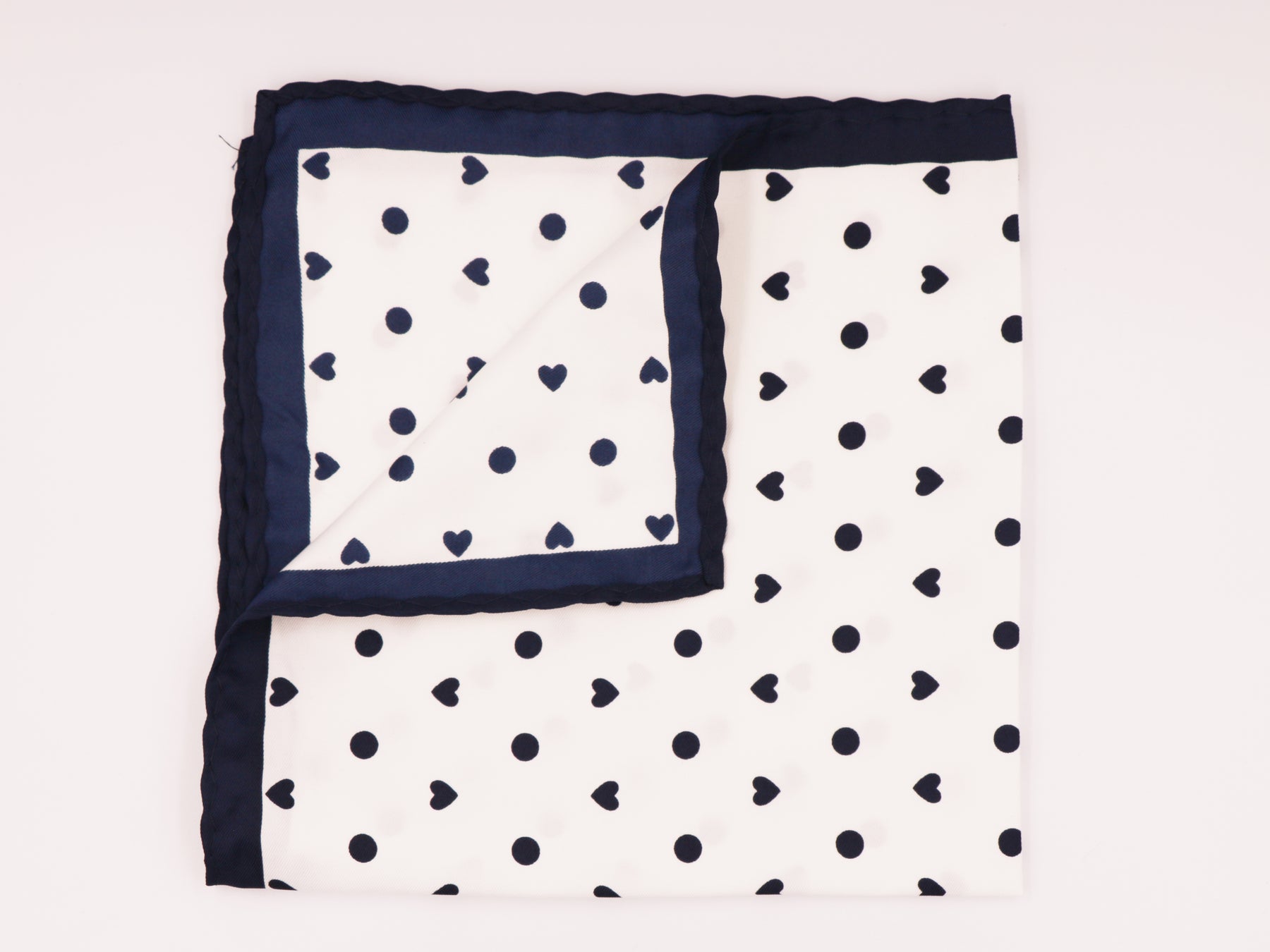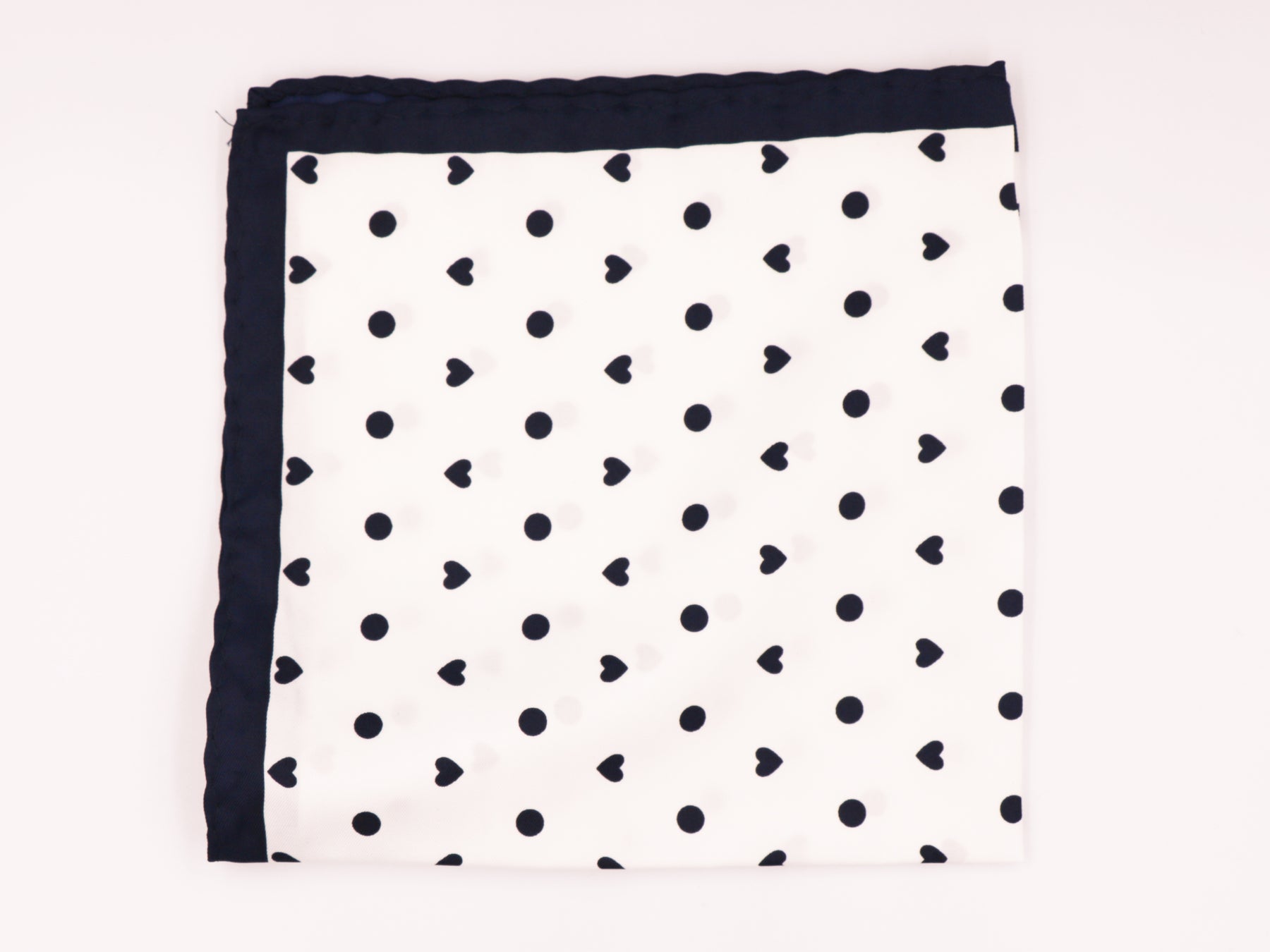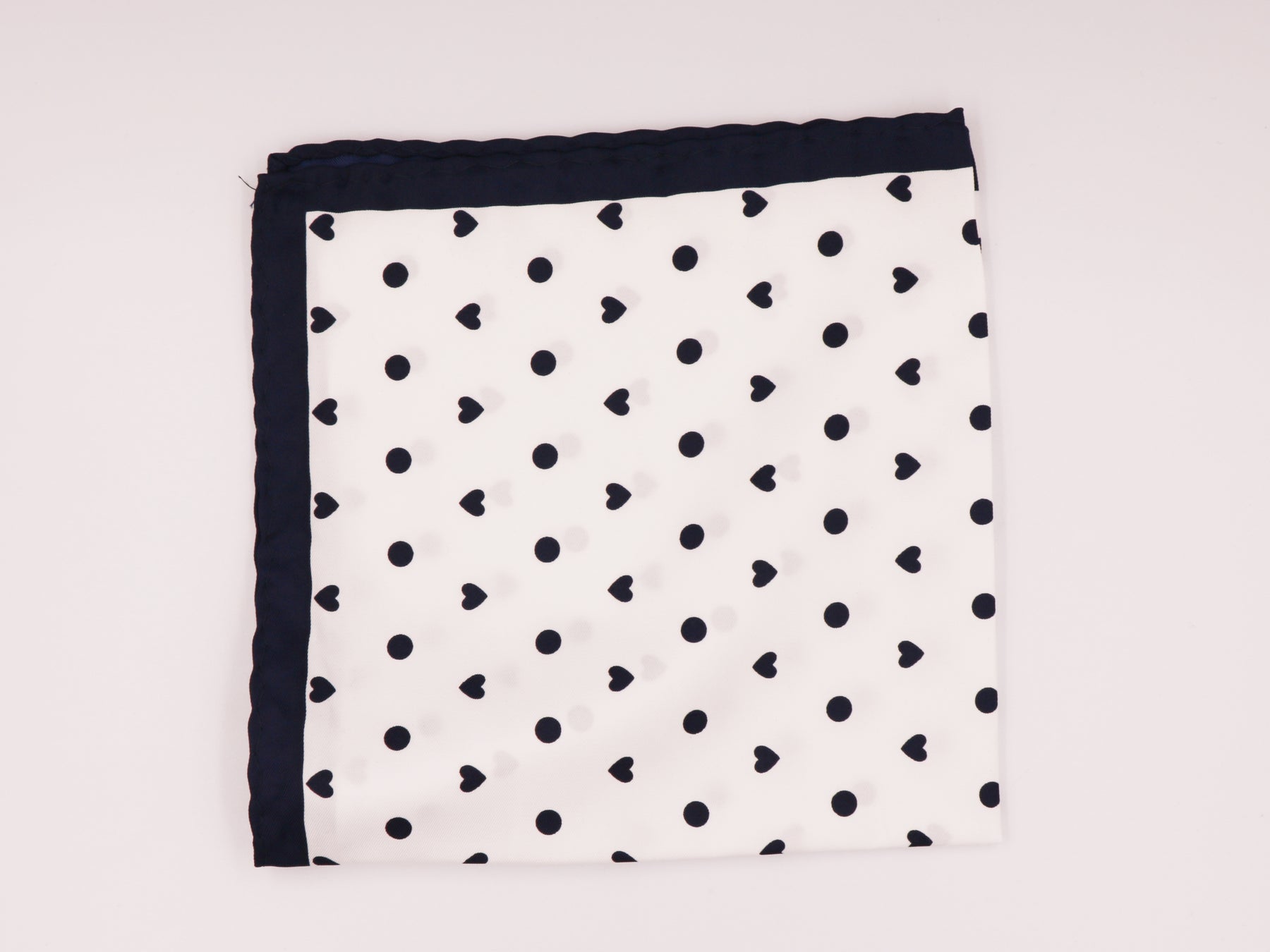 Inject some playful charm with this extra large Mens handkerchief. Featuring a fun, yet professional repeat pattern of navy hearts and circles on a crisp white background. A navy border surrounds the print to provide extra contrast, framing your fold beautifully.