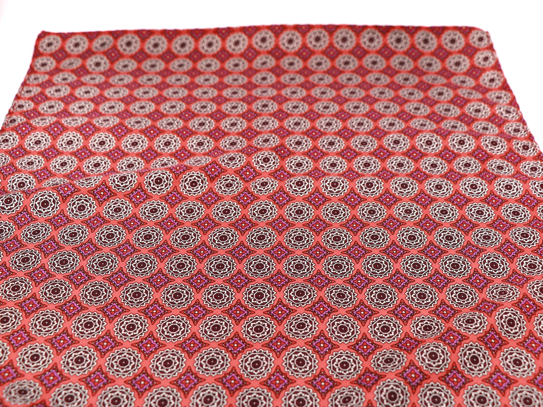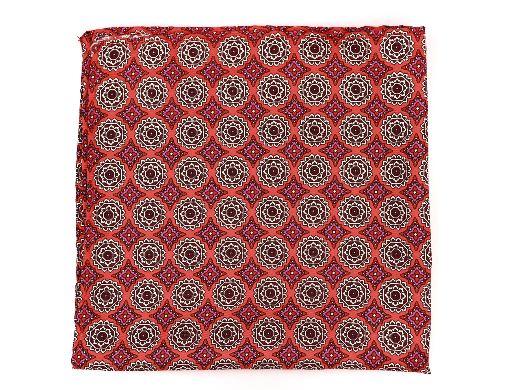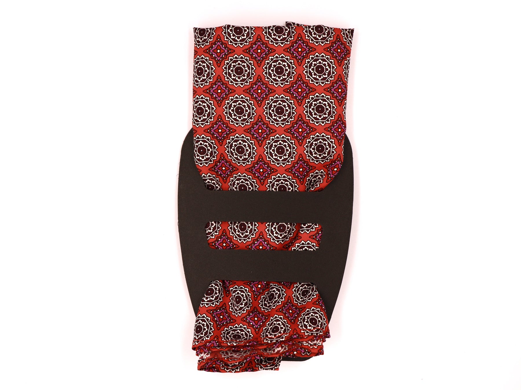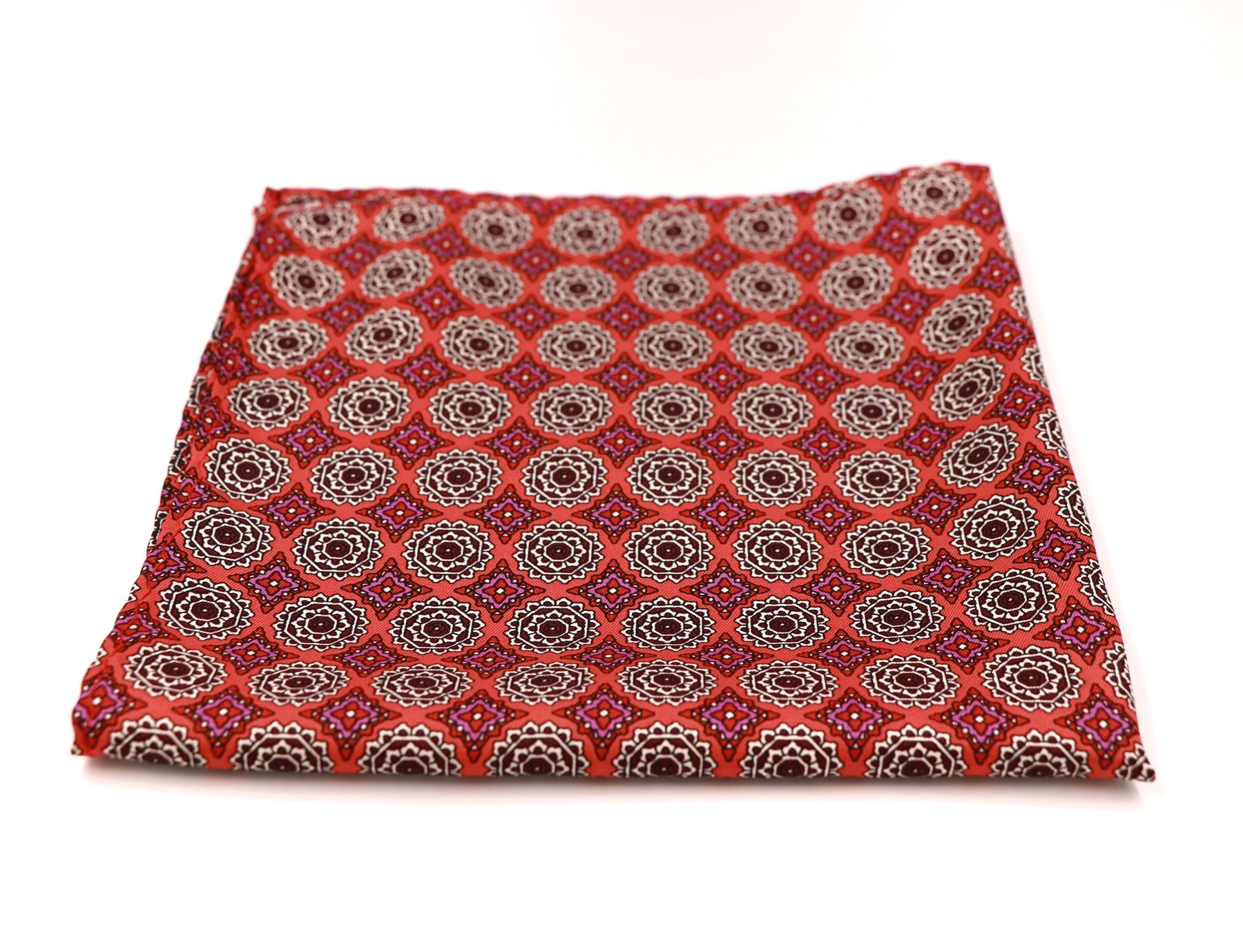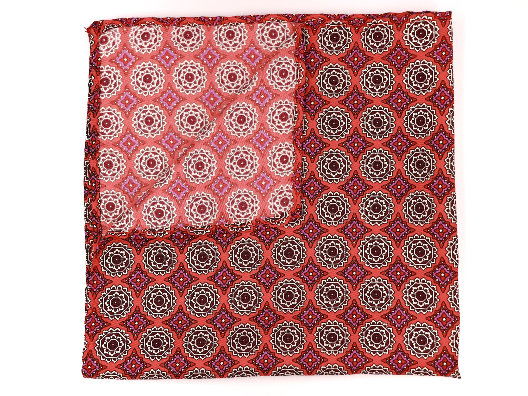 This large mens pocket square features an opulent print in striking, warm shades of red, brown, and a touch of magenta. This symmetrical pattern offers a luxury look that draws the eye.