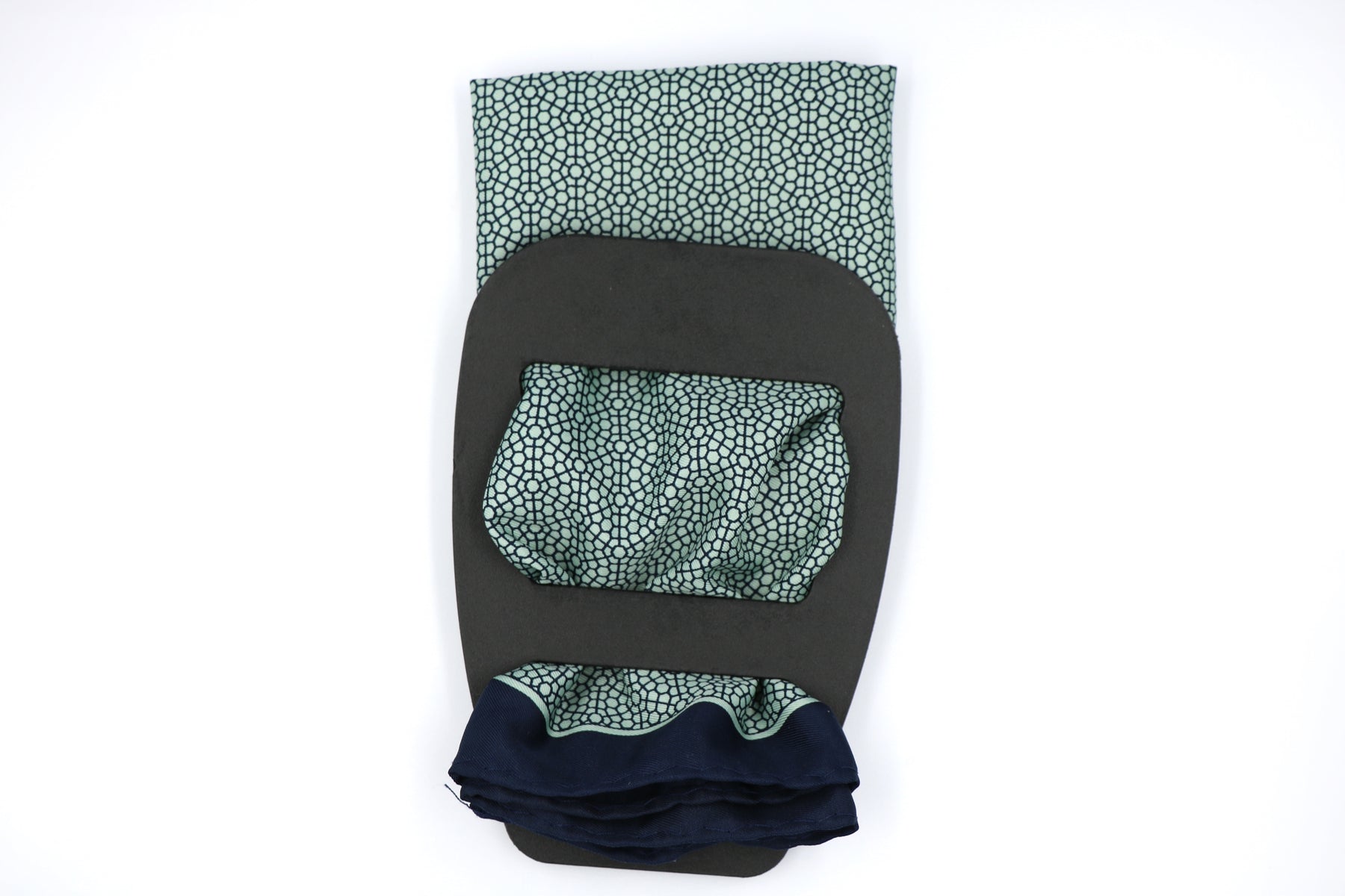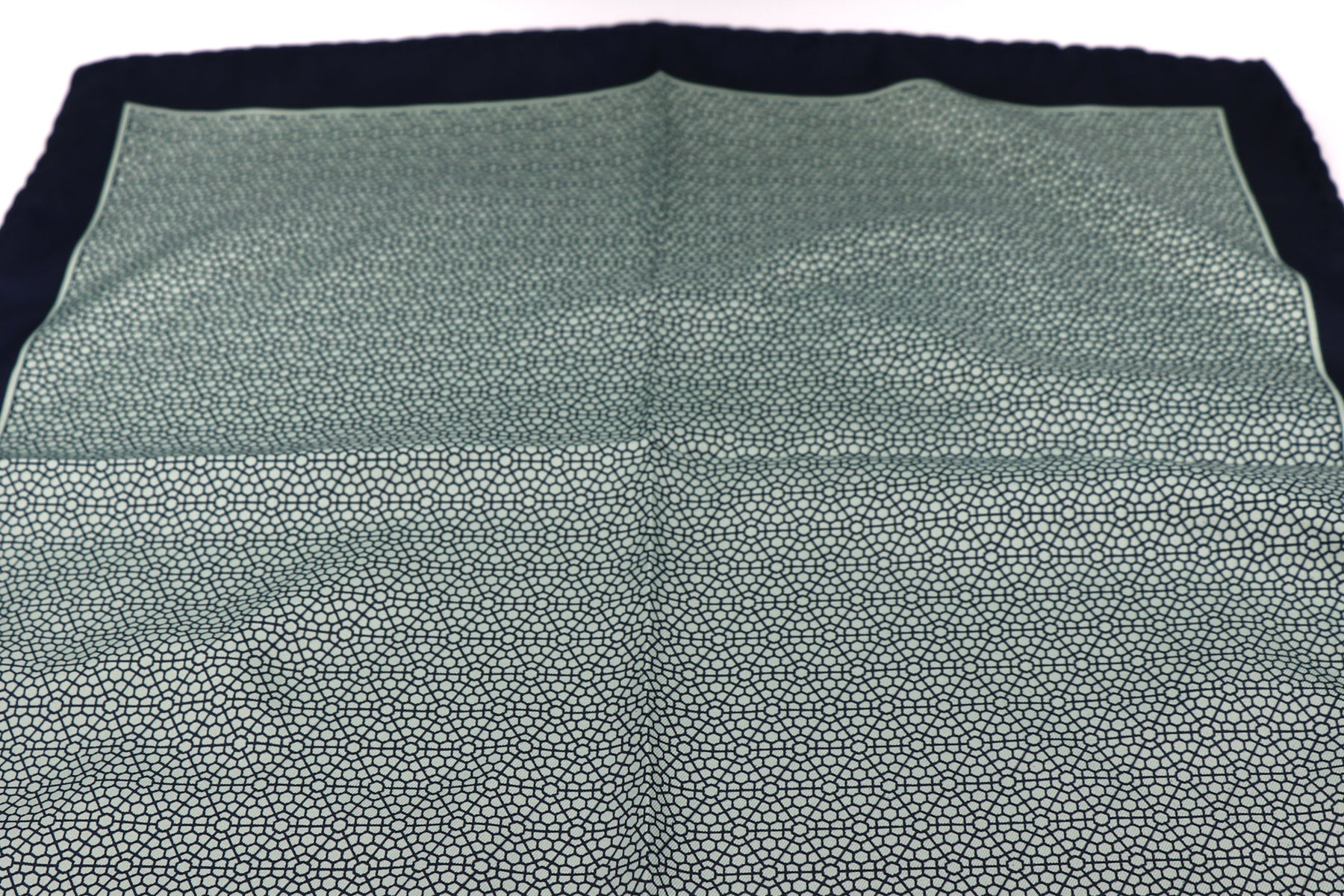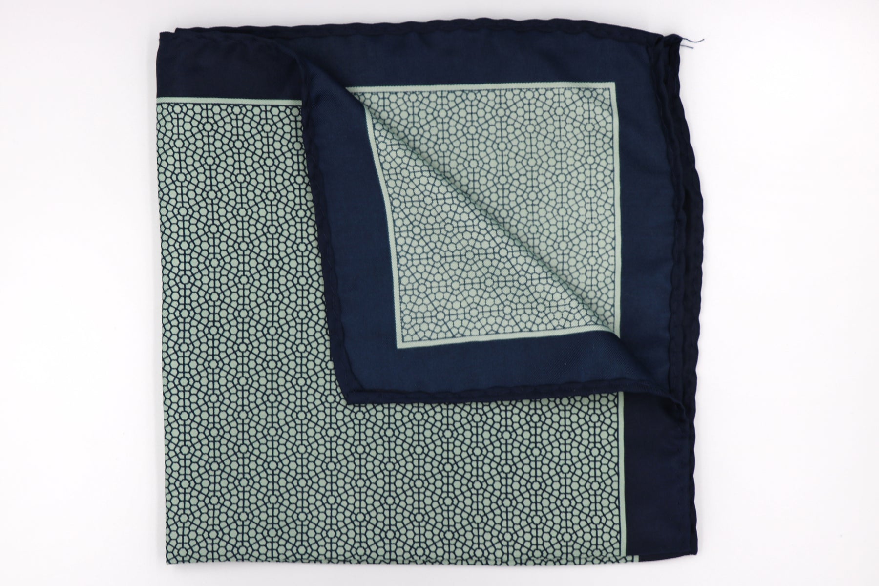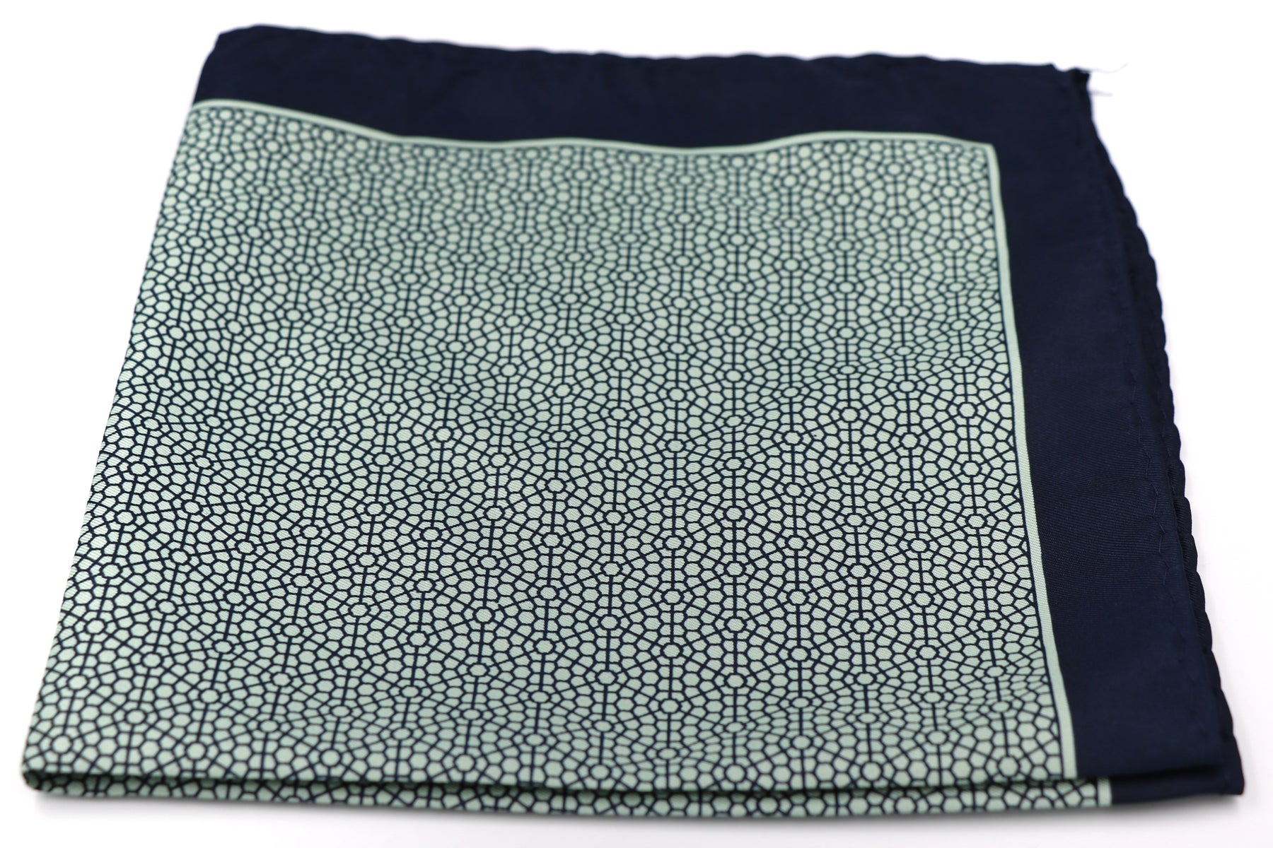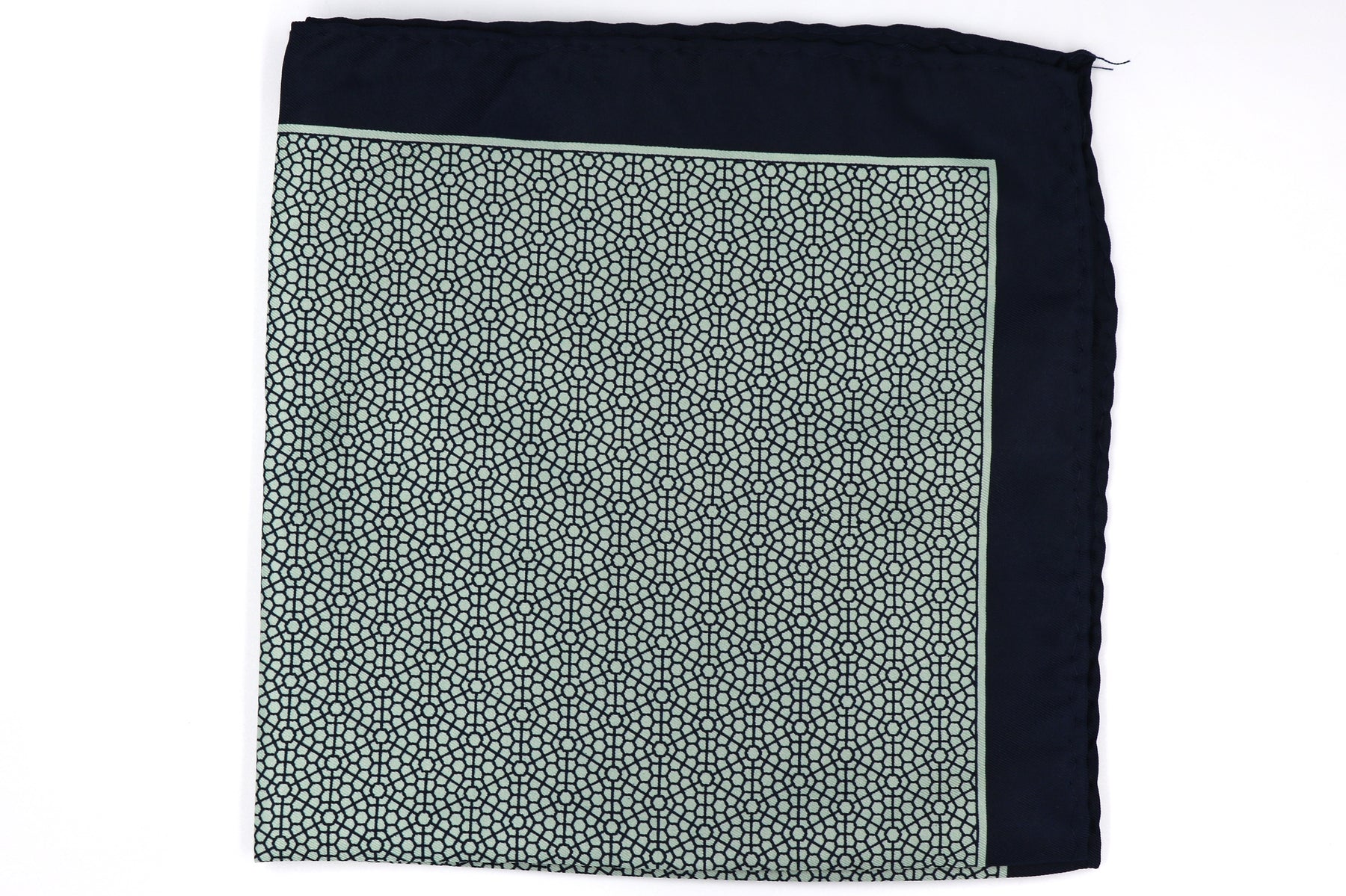 This men's pocket square is a stylish handkerchief accessory measuring 32cm by 32cm. It features a unique geometric honeycomb pattern in a sage green, framed by a deep navy border.