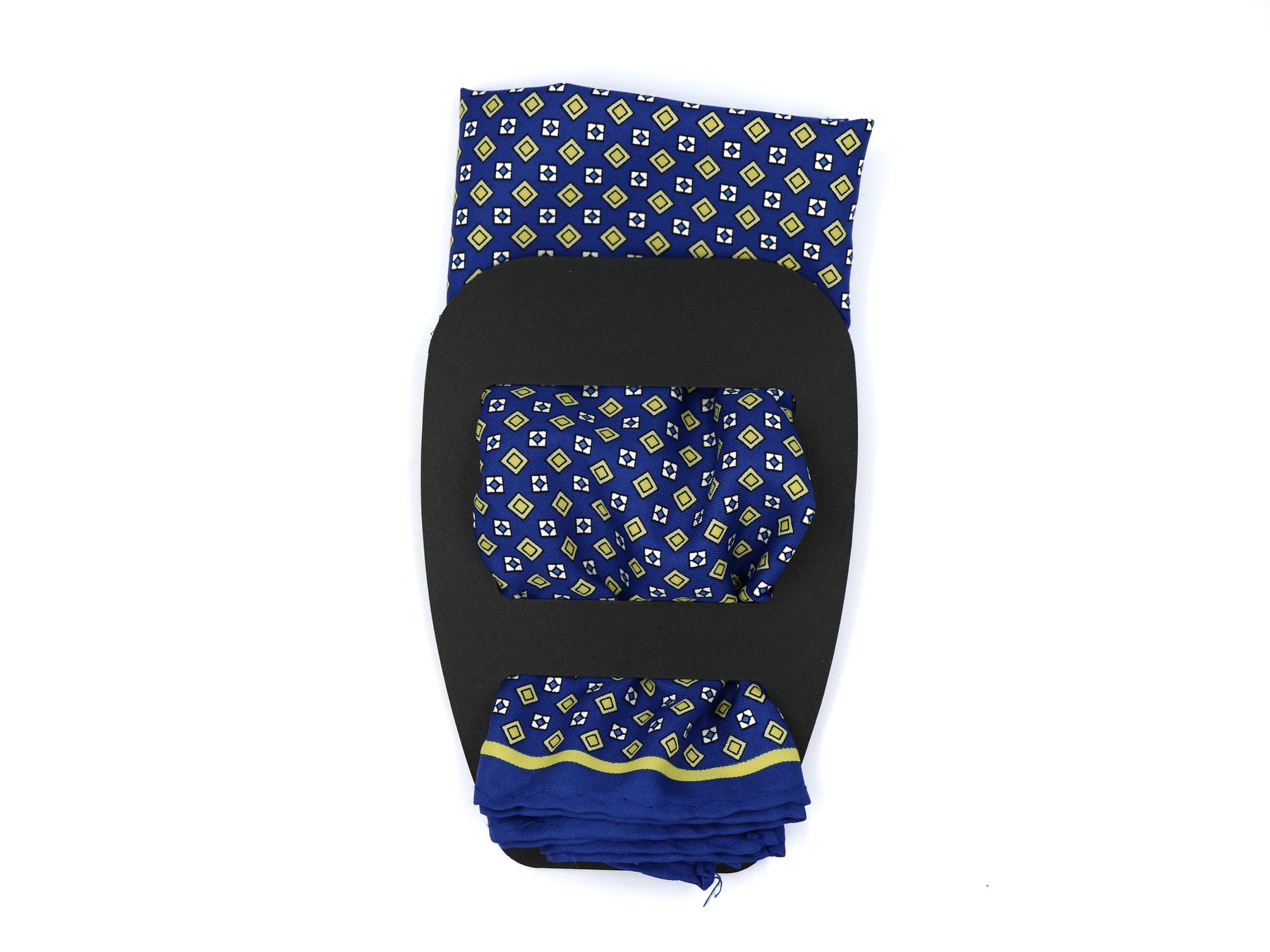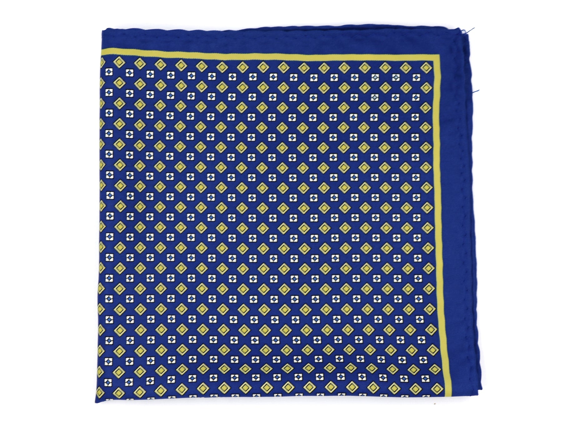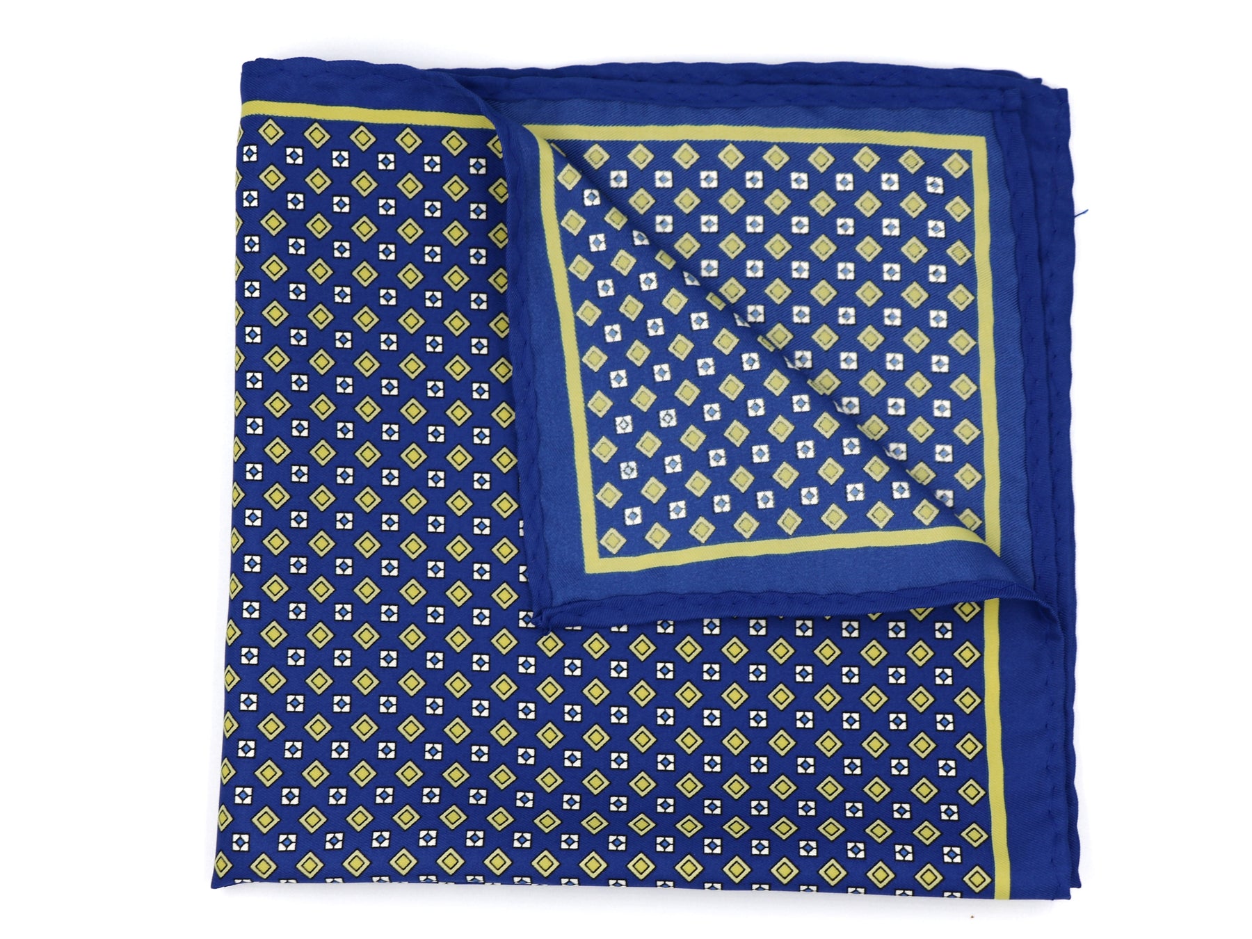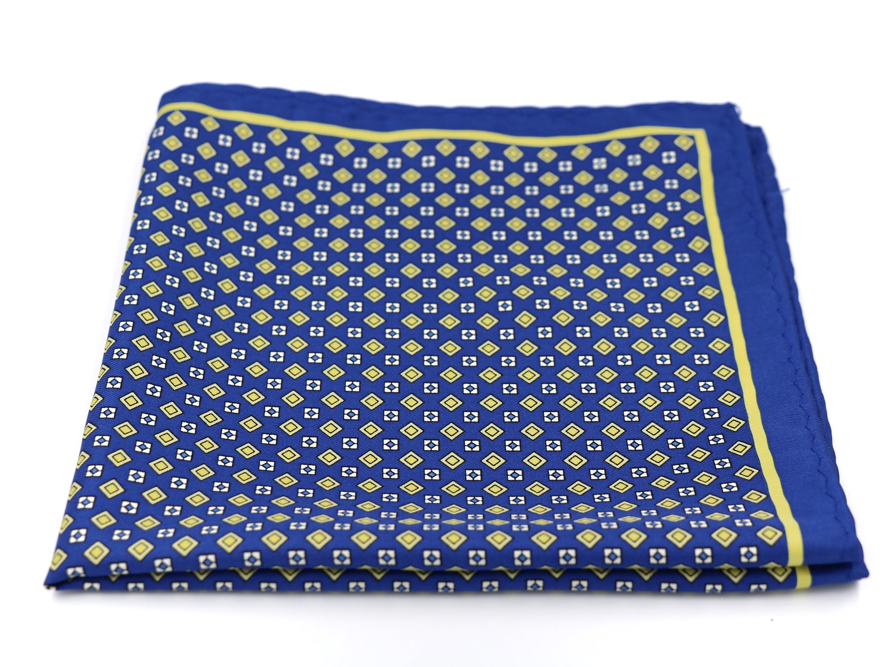 This large pocket square is a superb addition to any wardrobe. The rich blue background is beautifully complemented by the intricate yellow and white diamond pattern, creating a sophisticated visual appeal that is both eye-catching and refined.