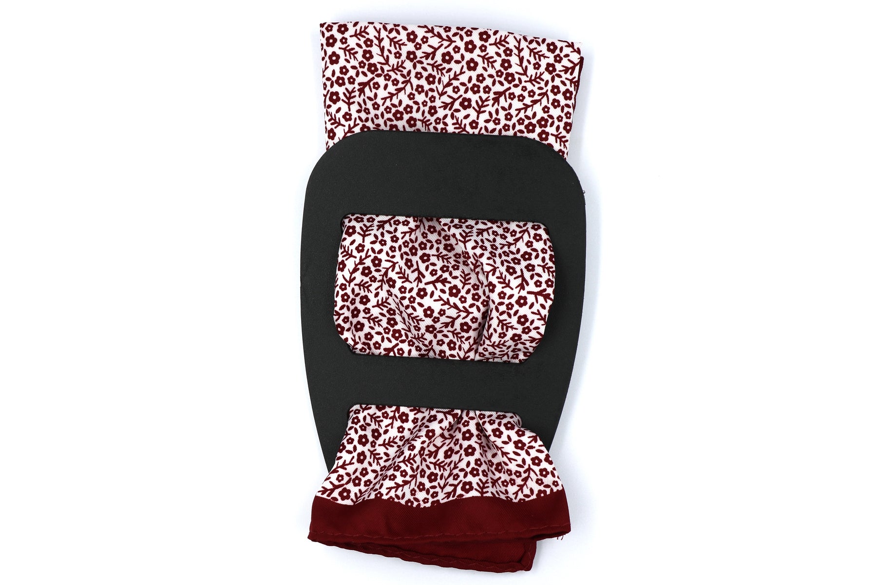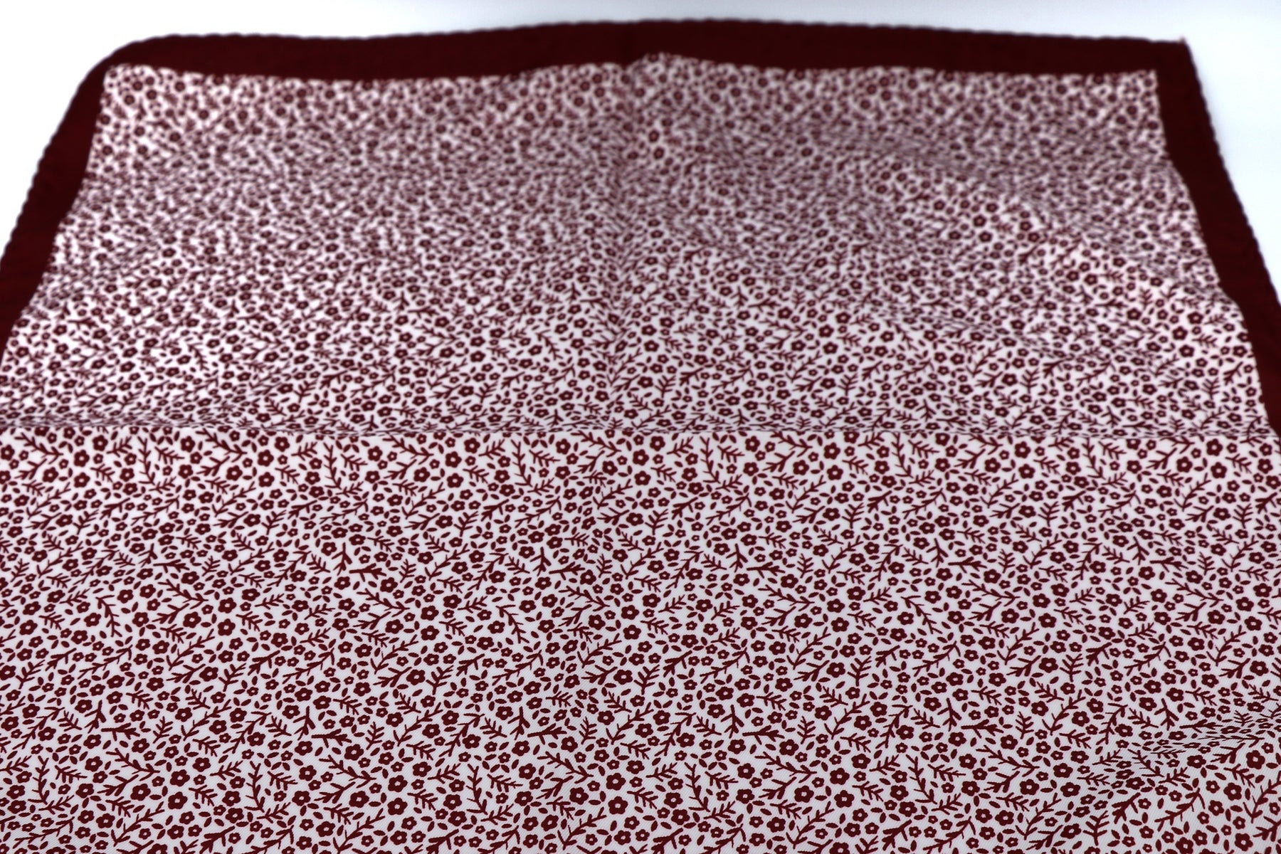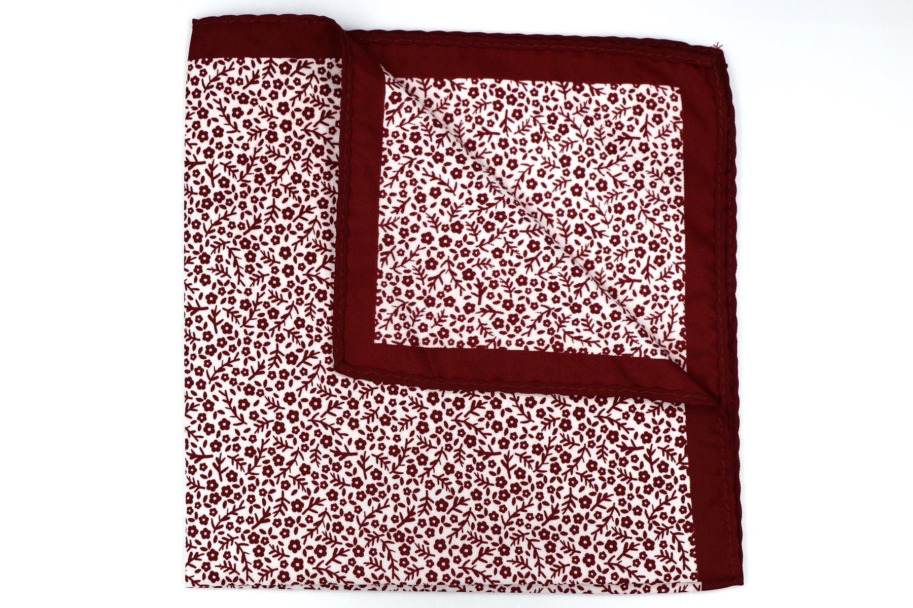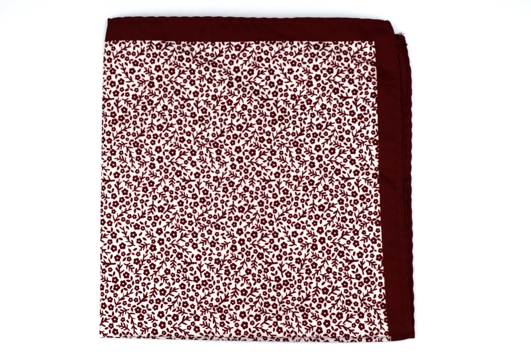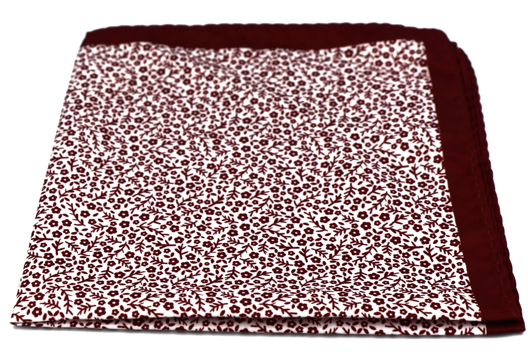 This charming extra large Mens handkerchief, features a classic and detailed burgundy floral pattern set against a crisp off-white background. This large pocket square measures a generous 32cm by 32cm.