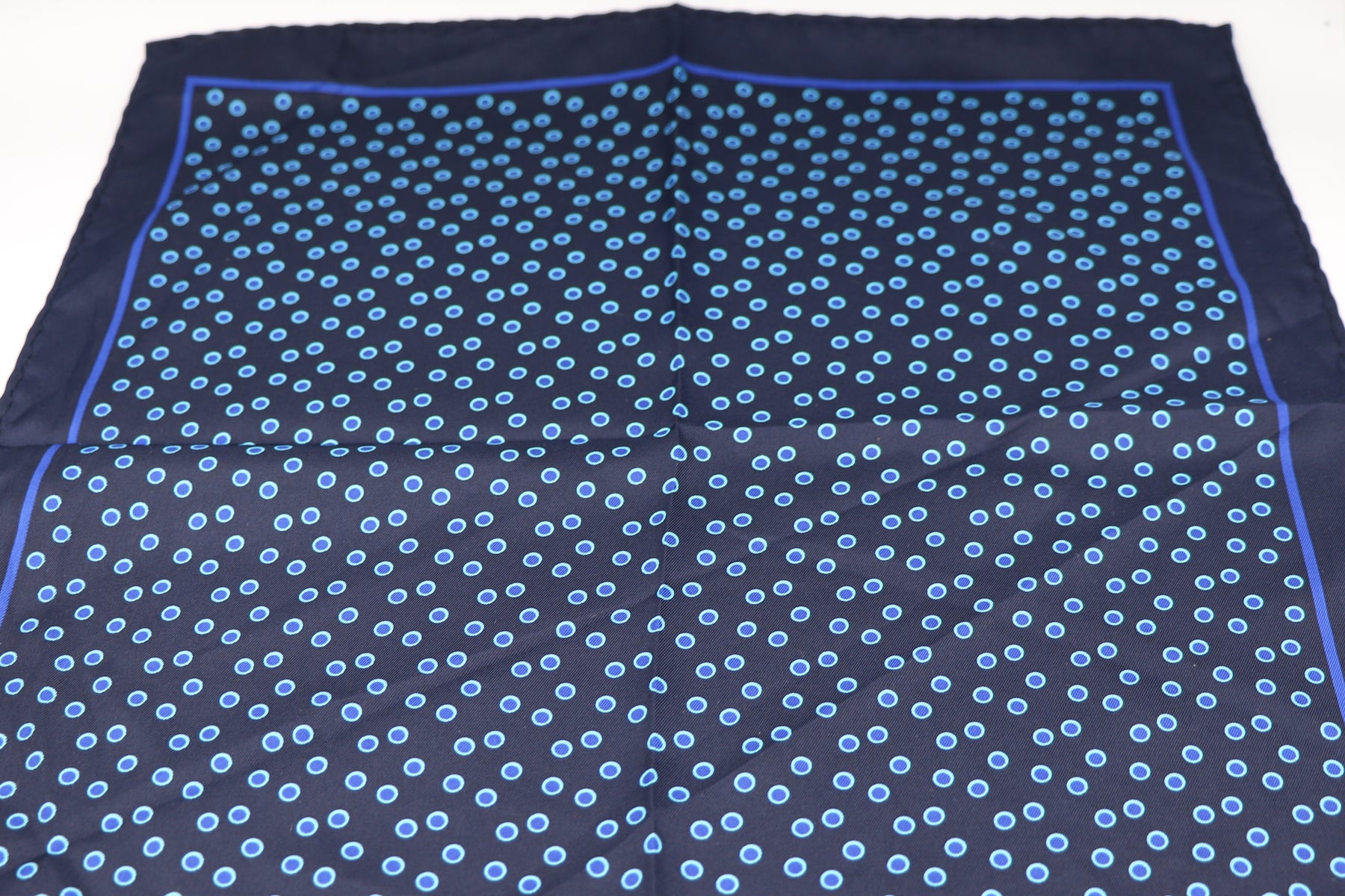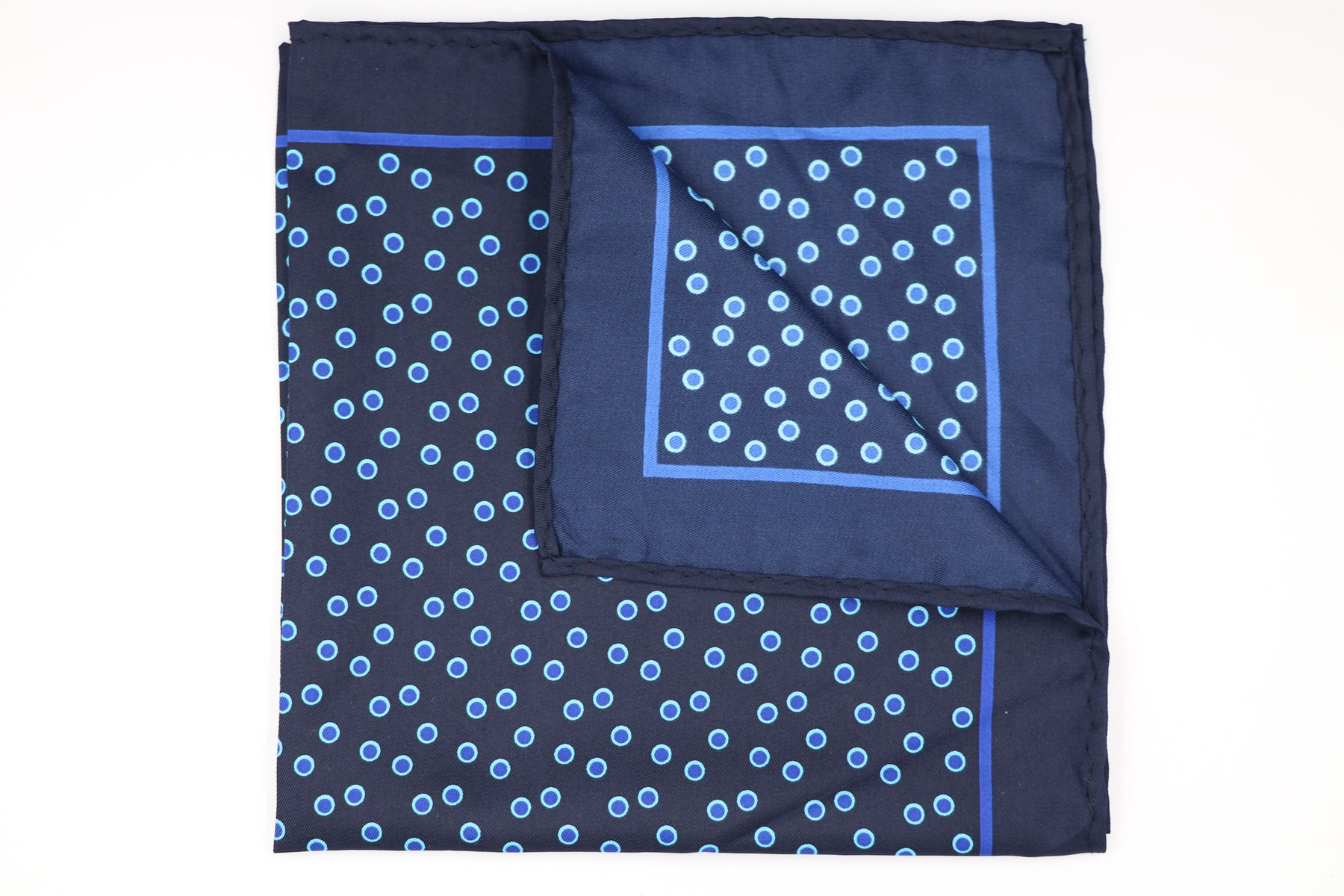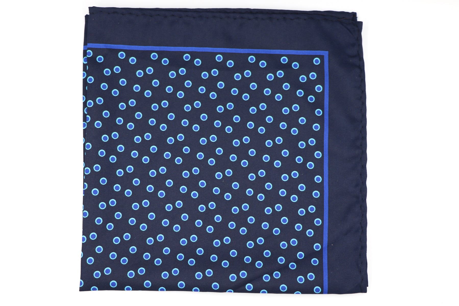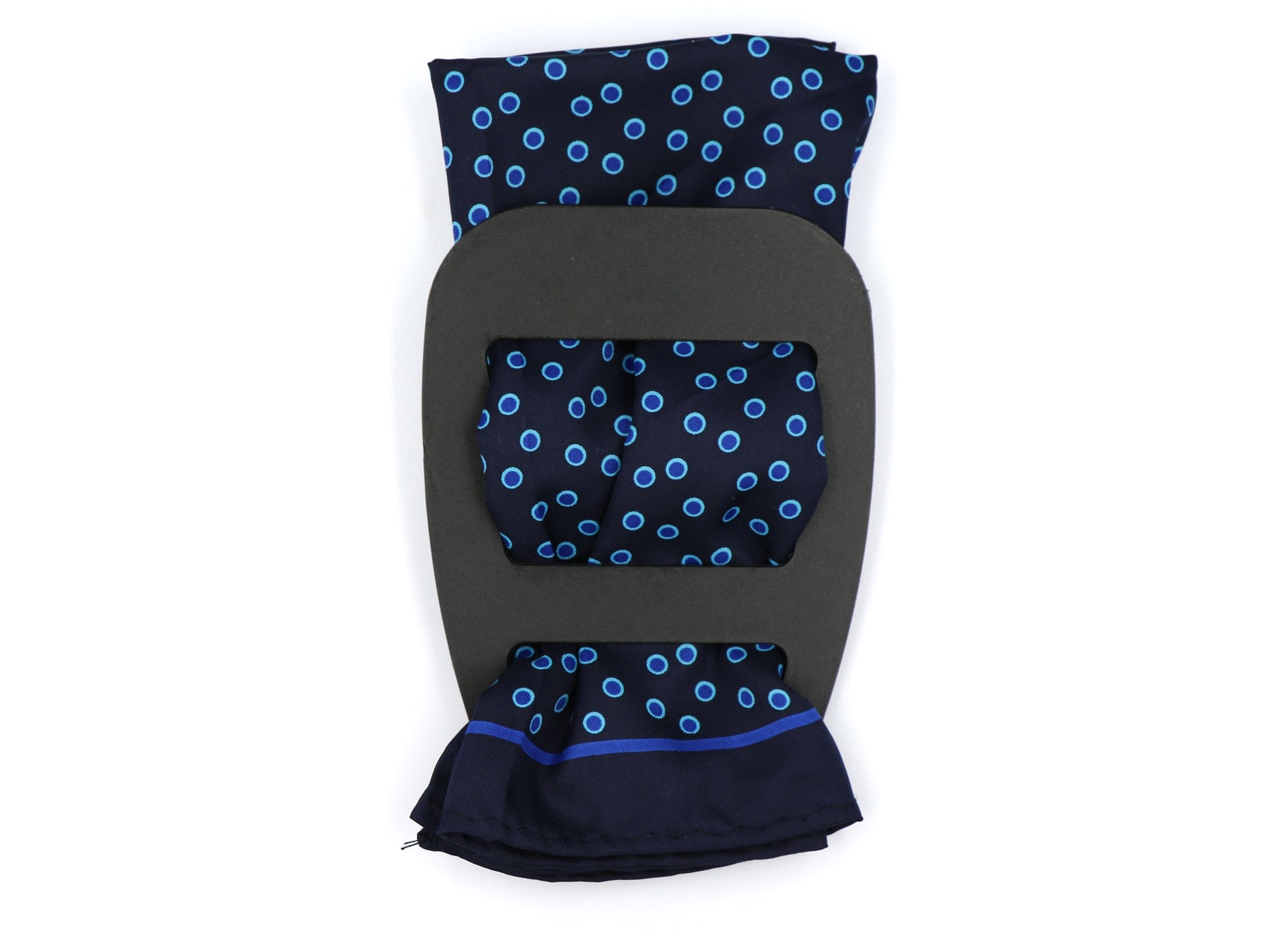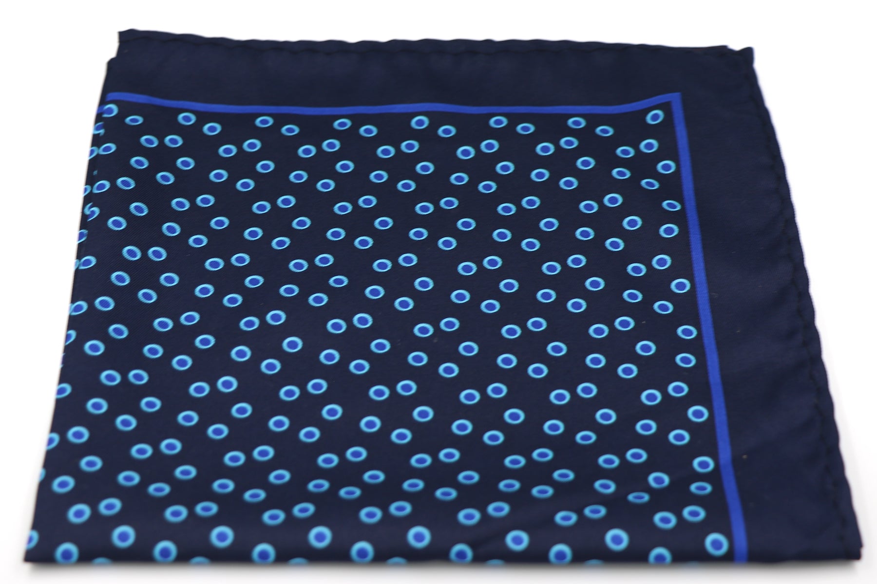 • This is a smart and stylish men's pocket square that features a timeless circular print design against a deep navy background. The pattern uses a mix of light blue and medium blue tones for a clean, eye-catching look.