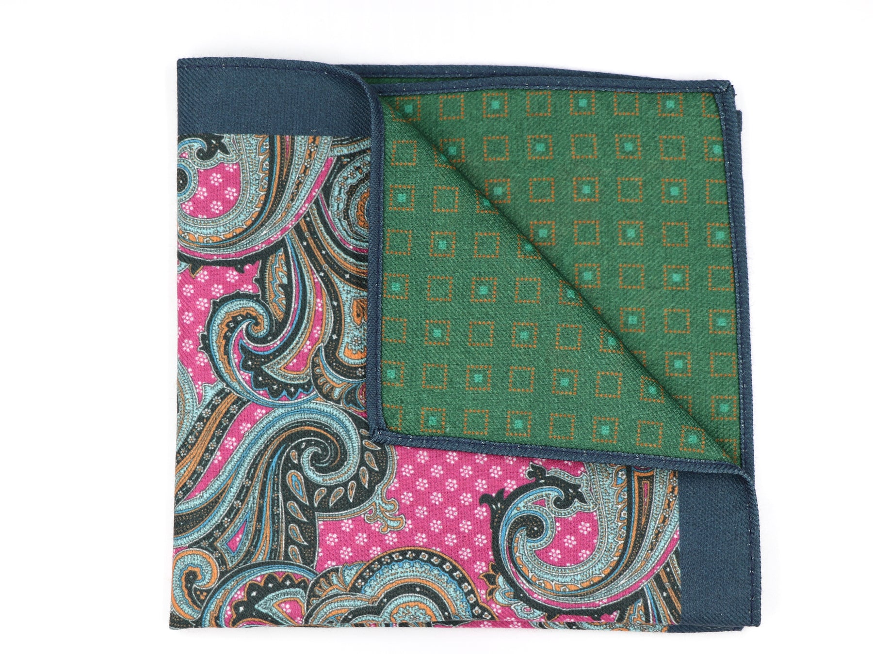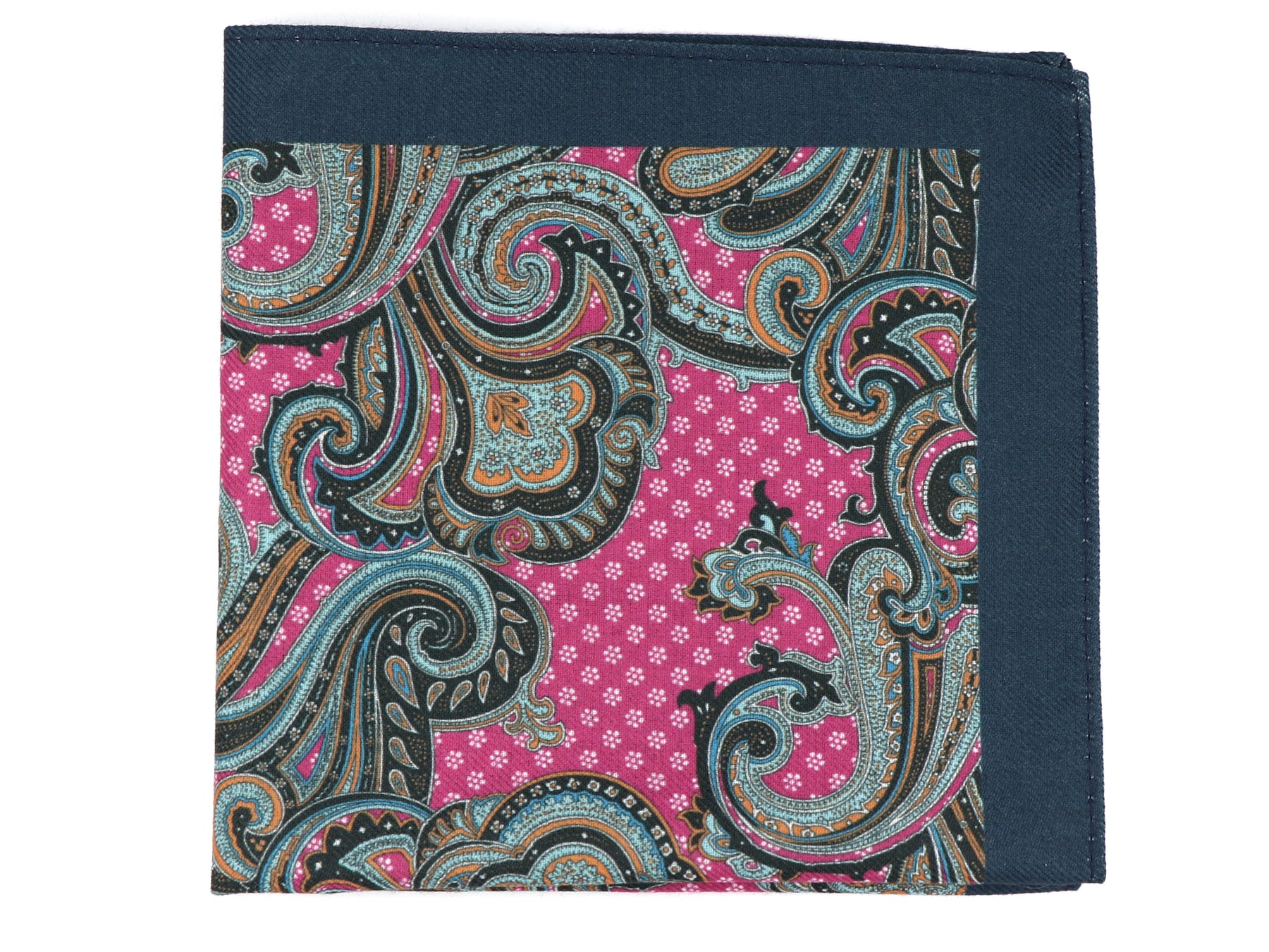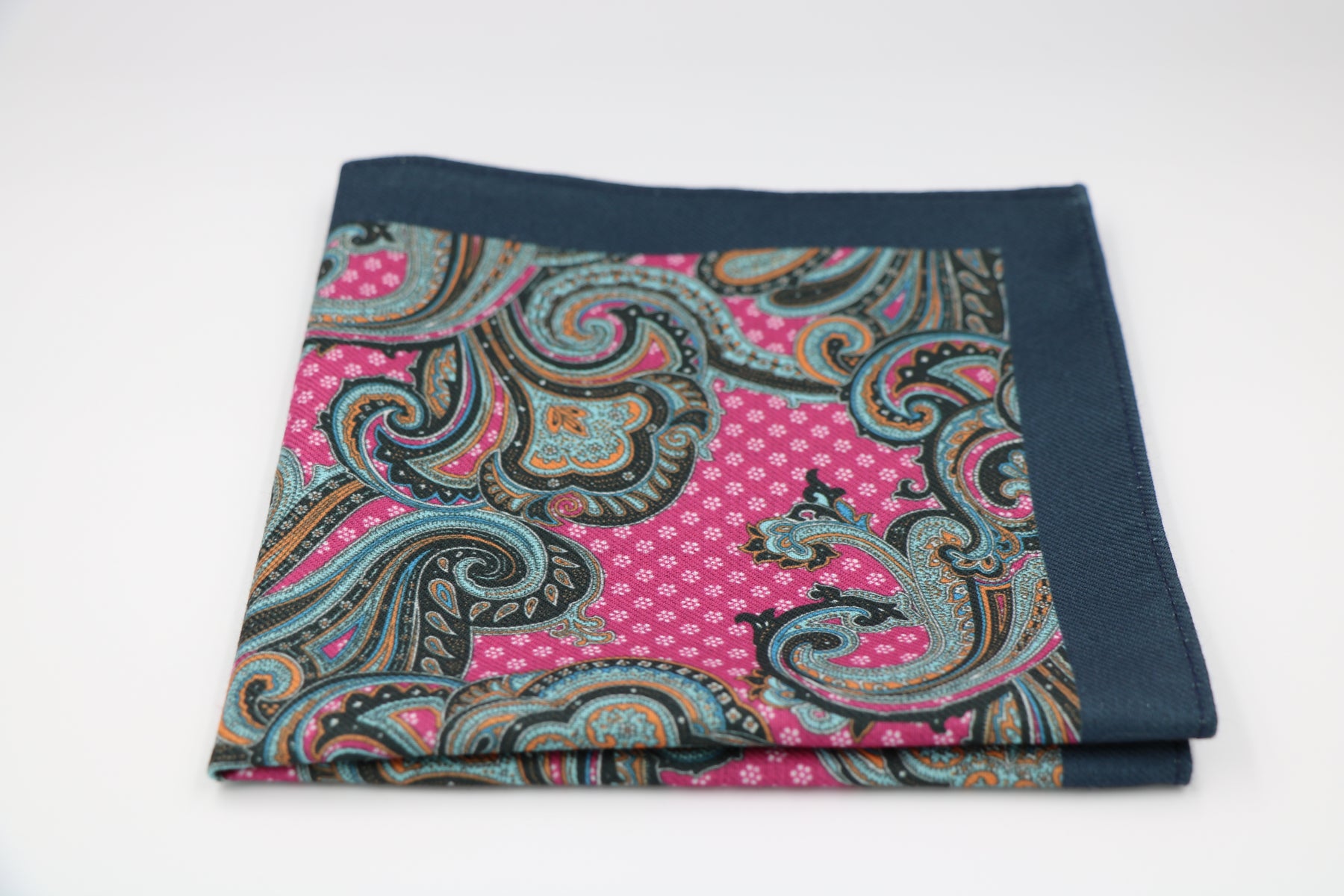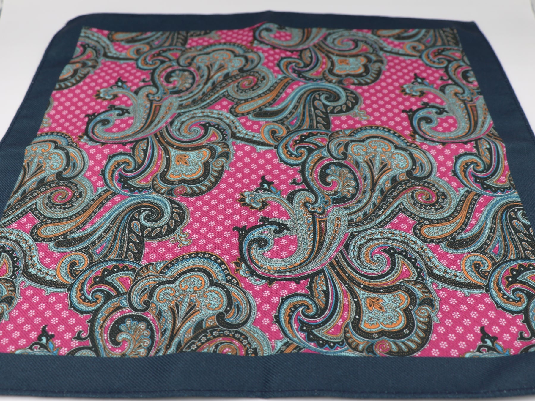 Keywords: silk feel pocket square, men's handkerchief, pink, dark blue, paisley print, versatile accessory, large pocket square, 32cm by 32cm, flexible, wedding pocket square, races attire, social occasions, workwear, nights out, go-to accessory, blazer accessory, suit jacket accessory, waistcoat accessory, pocket square holder.