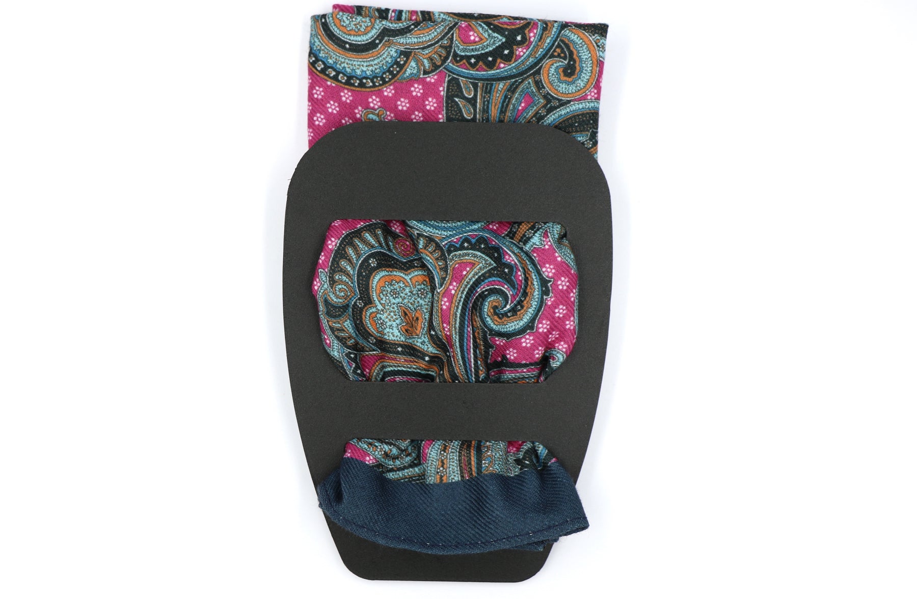 Regular price $28.00This silk feel pocket square is a men's accessory that bridges the gap between professional and casual wear. The classic paisley print in a combination of pink and dark blue creates a powerful visual statement. The vibrant pink adds a much-needed pop of colour, while the deep dark blue ensures it can be paired with a wide range of jacket colours, making it versatile.